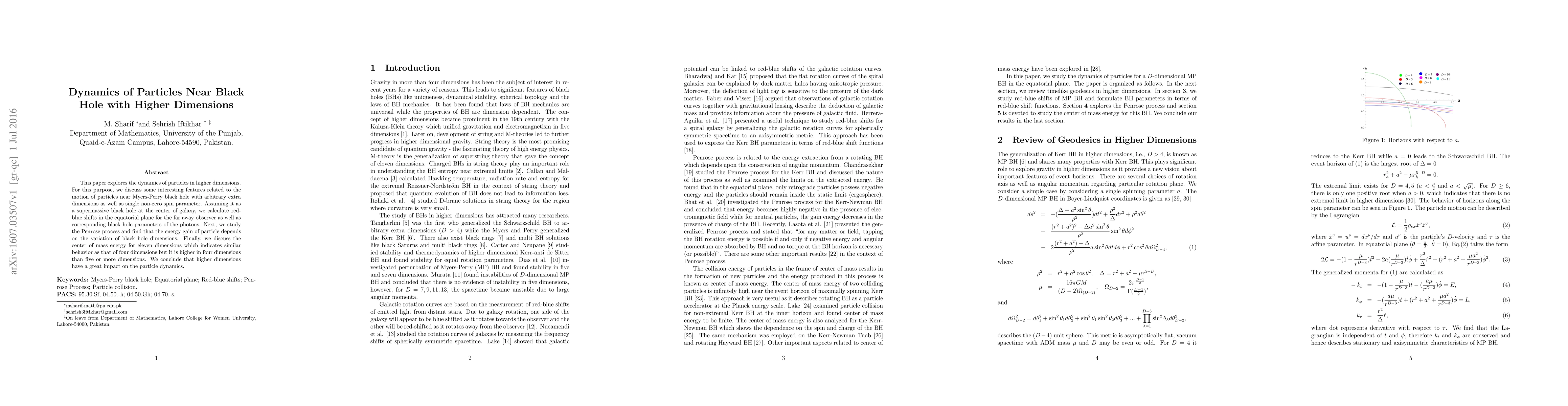 This paper explores the dynamics of particles in higher dimensions. For this purpose, we discuss some interesting features related to the motion of particles near Myers-Perry black hole with arbitrary extra dimensions as well as single non-zero spin parameter. Assuming it as a supermassive black hole at the center of galaxy, we calculate red-blue shifts in the equatorial plane for the far away observer as well as corresponding black hole parameters of the photons. Next, we study the Penrose process and find that the energy gain of particle depends on the variation of black hole dimensions. Finally, we discuss the center of mass energy for eleven dimensions which indicates similar behavior as that of four dimensions but it is higher in four dimensions than five or more dimensions. We conclude that higher dimensions have a great impact on the particle dynamics.