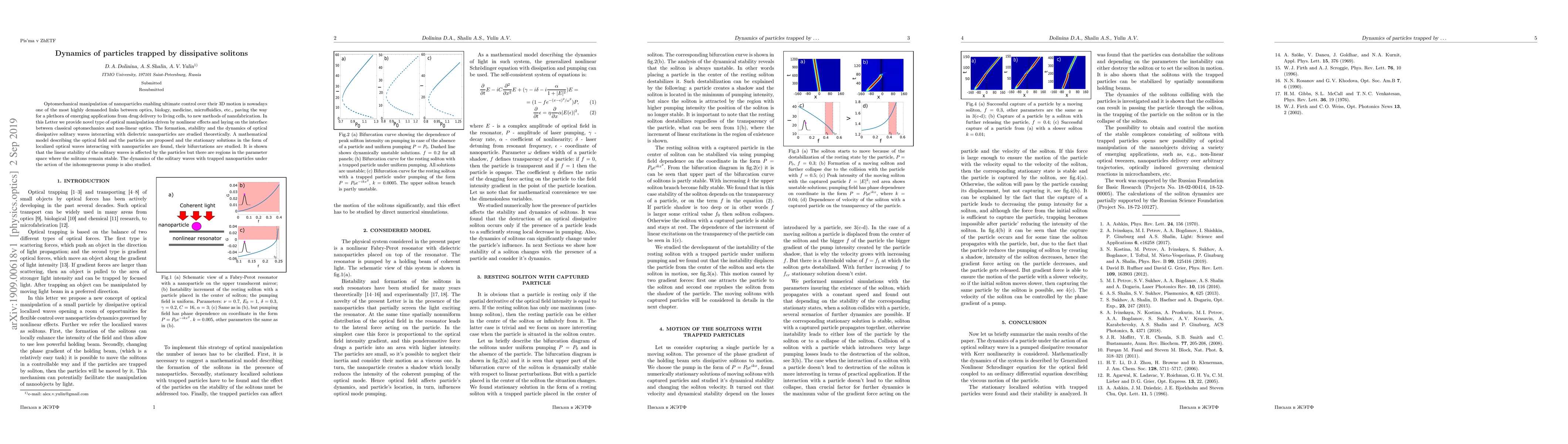 Optomechanical manipulation of nanoparticles enabling ultimate control over their 3D motion is nowadays one of the most highly demanded links between optics, biology, medicine, microfluidics, etc., paving the way for a plethora of emerging applications from drug delivery to living cells, to new methods of nanofabrication. In this Letter we provide novel type of optical manipulation driven by nonlinear effects and laying on the interface between classical optomechanics and non-linear optics. The formation, stability and the dynamics of optical dissipative solitary waves interacting with dielectric nanoparticles are studied theoretically. A mathematical model describing the optical field and the particles are proposed and the stationary solutions in the form of localized optical waves interacting with nanoparticles are found, their bifurctations are studied. It is shown that the linear stability of the solitary waves is affected by the particles but there are regions in the parameter space where the solitons remain stable. The dynamics of the solitary waves with trapped nanoparticles under the action of the inhomogeneous pump is also studied.