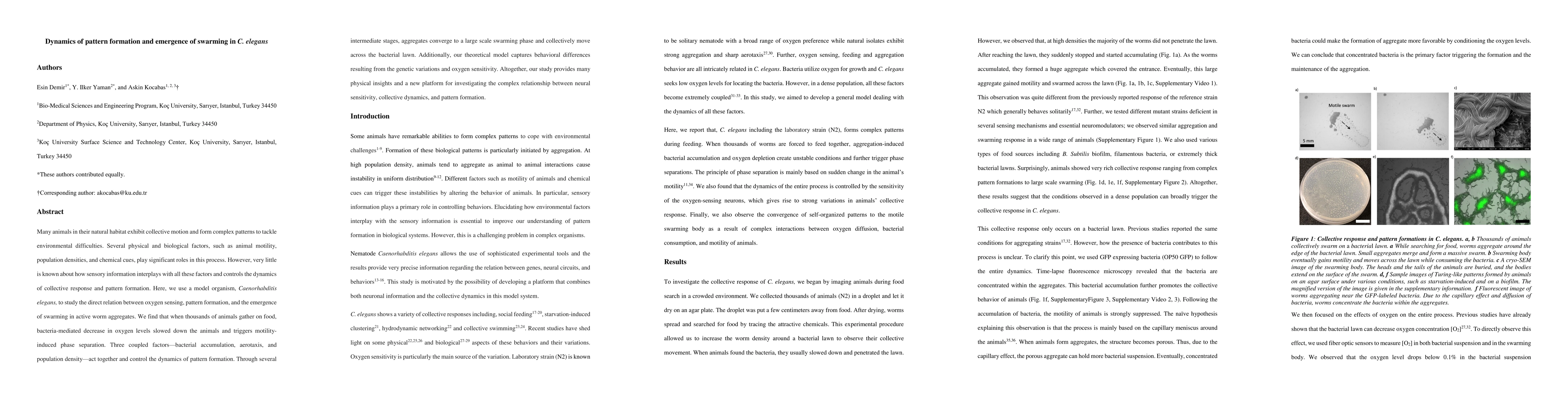 This paper explores how sensory information, particularly oxygen sensing, interacts with motility, population density, and chemical cues to influence pattern formation and swarming in Caenorhabditis elegans. The study reveals that decreased oxygen levels due to bacterial accumulation trigger motility-induced phase separation, leading to collective swarming behavior.