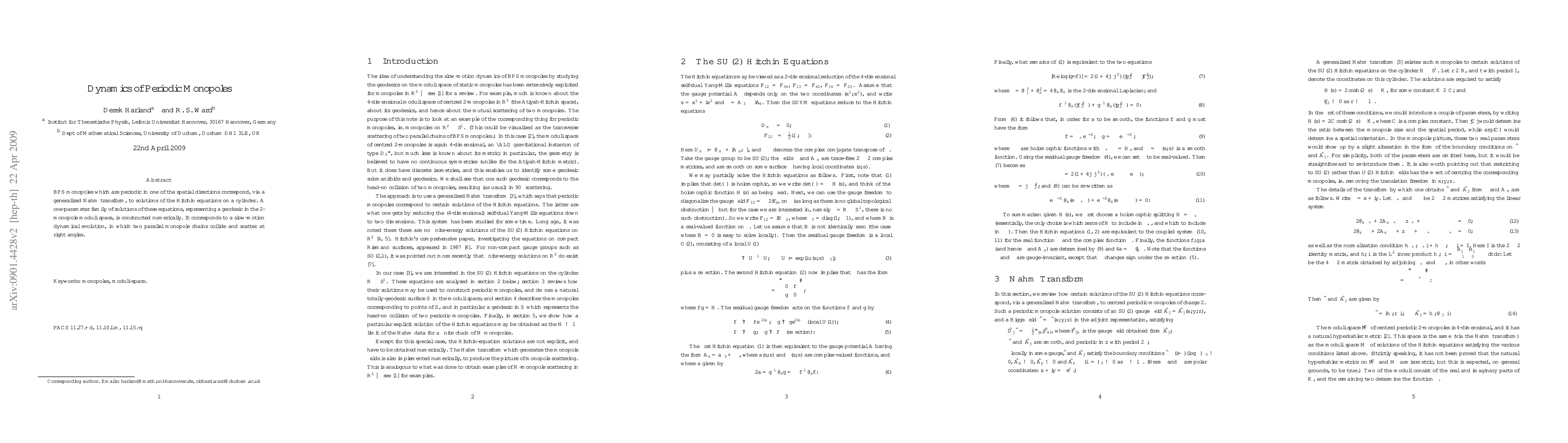 Researchers found a numerical solution to the Hitchin equations representing a geodesic in the 2-monopole moduli space, showing two parallel monopole chains colliding and scattering at right angles.