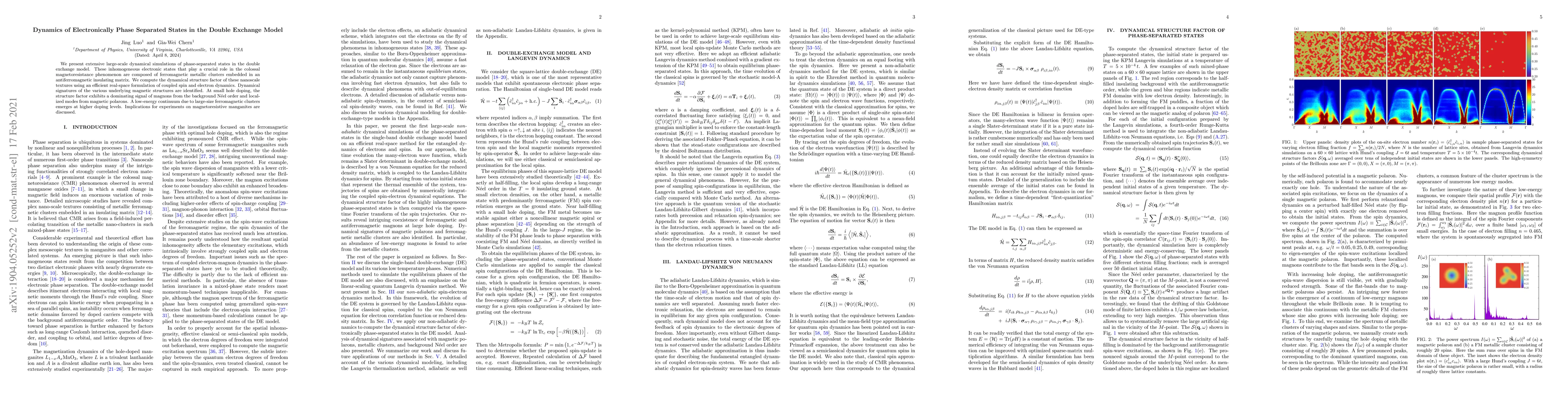 We present extensive large-scale dynamical simulations of phase-separated states in the double exchange model. These inhomogeneous electronic states that play a crucial role in the colossal magnetoresistance phenomenon are composed of ferromagnetic metallic clusters embedded in an antiferromagnetic insulating matrix. We compute the dynamical structure factor of these nanoscale textures using an efficient real-space formulation of coupled spin and electron dynamics. Dynamical signatures of the various underlying magnetic structures are identified. At small hole doping, the structure factor exhibits a dominating signal of magnons from the background N\'eel order and localized modes from magnetic polarons. A low-energy continuum due to large-size ferromagnetic clusters emerges at higher doping levels. Implications for experiments on magnetoresistive manganites are discussed.