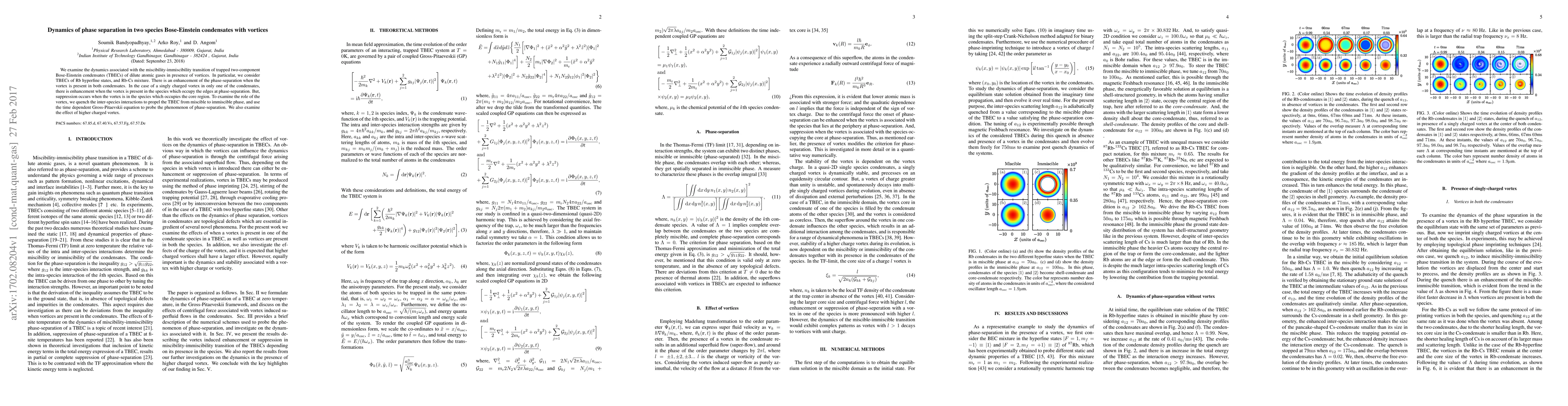 This paper explores the dynamics of phase separation in two-species Bose-Einstein condensates with vortices, showing that vortex presence enhances phase separation in Rb hyperfine states and Rb-Cs mixtures. The effect varies depending on vortex location relative to phase-separation regions, with suppression in core regions and enhancement in edge regions.