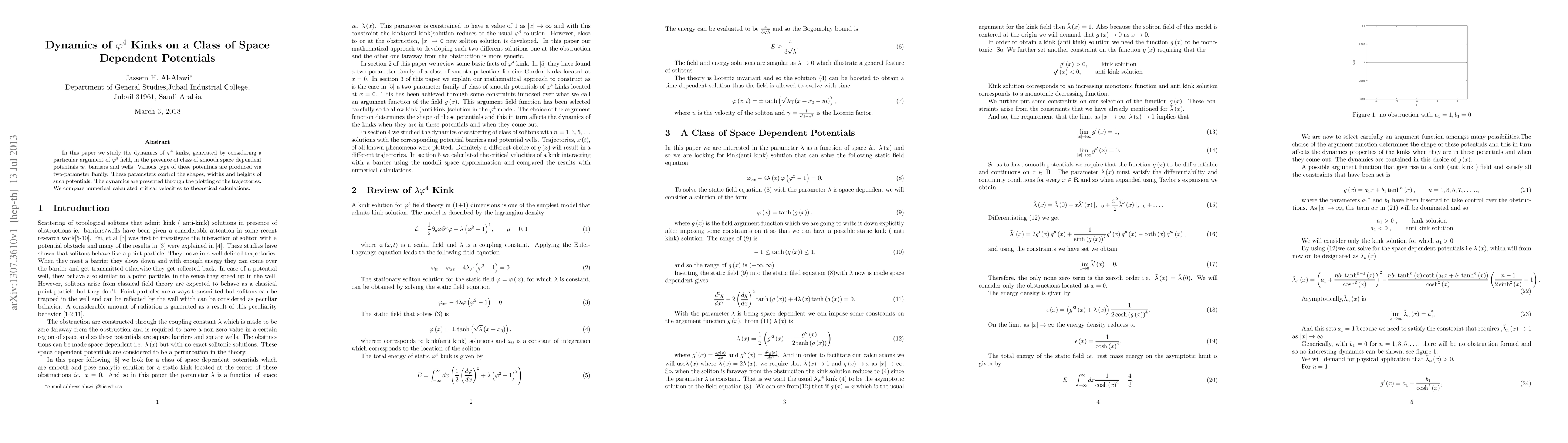 In this paper we study the dynamics of $\varphi^{4}$ kinks, generated by considering a particular argument of $\varphi^{4}$ field, in the presence of class of smooth space dependent potentials ie. barriers and wells. Various type of these potentials are produced via two-parameter family. These parameters control the shapes, widths and heights of such potentials. The dynamics are presented through the plotting of the trajectories. We compare numerical calculated critical velocities to theoretical calculations.
