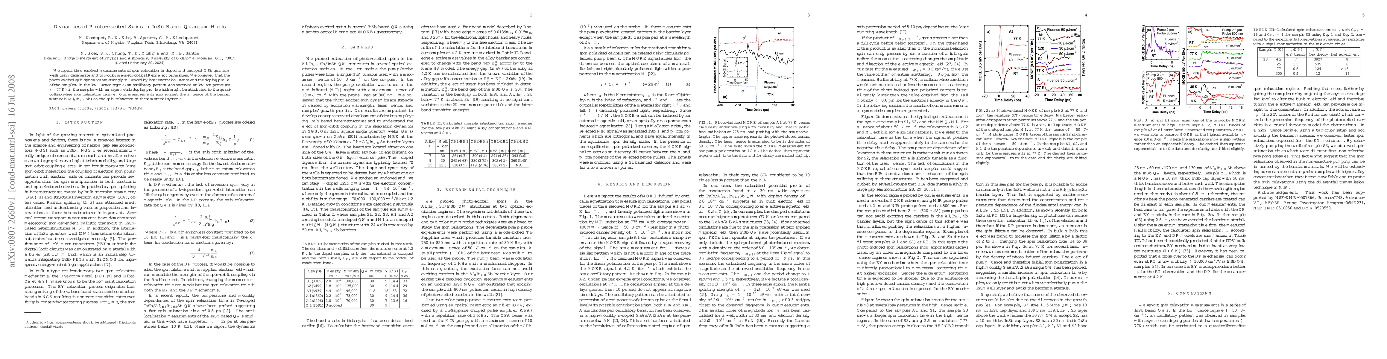 Researchers studied spin relaxation in InSb quantum wells using magneto-optical techniques, finding that photo-excited spins are influenced by laser fluence and doping profile, with an oscillatory pattern observed at low temperatures.