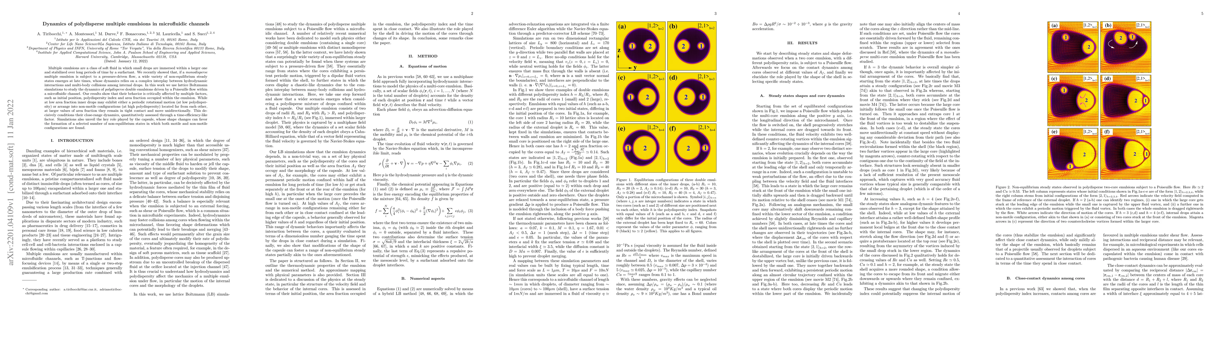 This study uses lattice Boltzmann simulations to examine polydisperse double emulsion dynamics in microfluidic channels under Poiseuille flow. Key findings include the significant influence of initial drop position, polydispersity, and area fraction on their behavior. At low area fractions, drops exhibit rotational motion or distant nonmotile arrangements based on polydispersity. At higher area fractions, drops stay in close contact and move unidirectionally. The emulsion's capsule shape also plays a crucial role in forming specific nonequilibrium states with motile and nonmotile configurations.