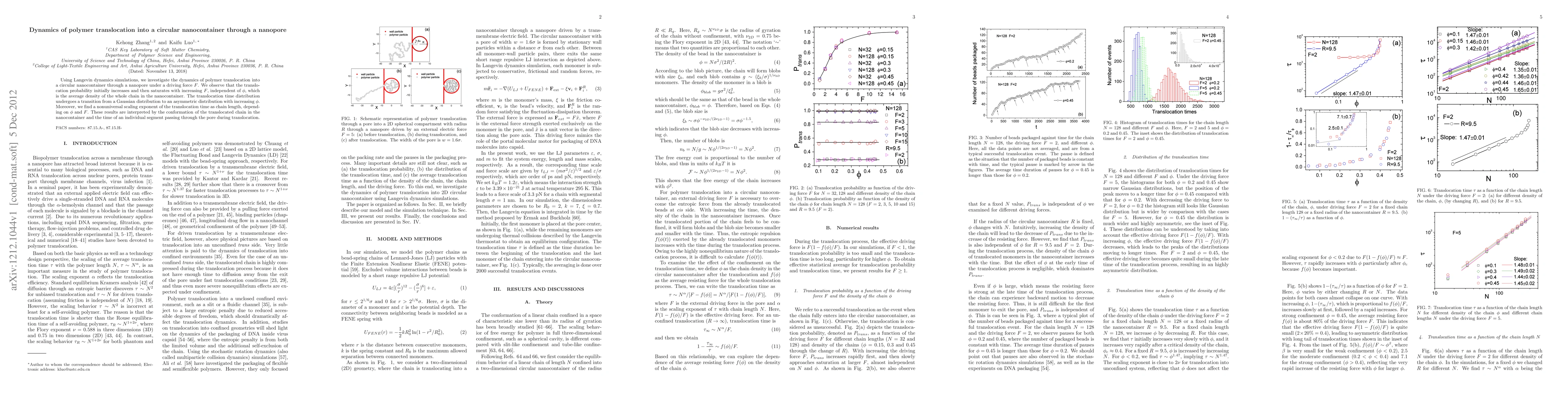 Summary: This study uses Langevin dynamics simulations to explore polymer translocation dynamics through a nanopore into a circular nanocontainer, revealing a saturation in translocation probability with increasing driving force, a transition in translocation time distribution, and a nonuniversal scaling of translocation time dependent on chain length, density, and force. The findings are linked to the chain's conformation and segment passage time.
