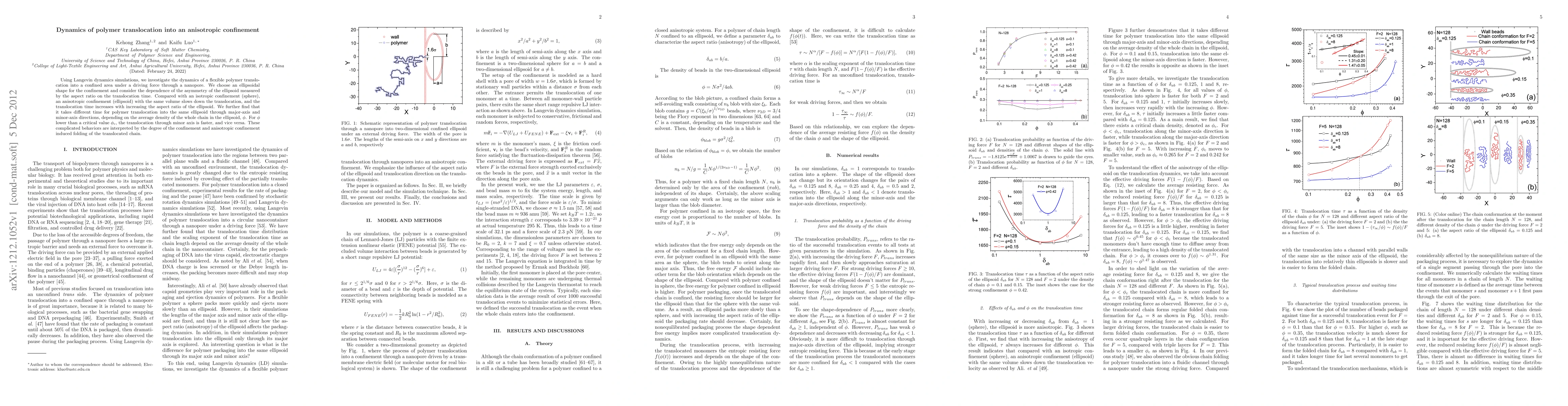 Using Langevin dynamics simulations, we investigate the dynamics of a flexible polymer translocation into a confined area under a driving force through a nanopore. We choose an ellipsoidal shape for the confinement and consider the dependence of the asymmetry of the ellipsoid measured by the aspect ratio on the translocation time. Compared with an isotropic confinement (sphere), an anisotropic confinement (ellipsoid) with the same volume slows down the translocation, and the translocation time increases with increasing the aspect ratio of the ellipsoid. We further find that it takes different time for polymer translocation into the same ellipsoid through major-axis and minor-axis directions, depending on the average density of the whole chain in the ellipsoid, $\phi$. For $\phi$ lower than a critical value $\phi_c$, the translocation through minor axis is faster, and vice versa. These complicated behaviors are interpreted by the degree of the confinement and anisotropic confinement induced folding of the translocated chain.