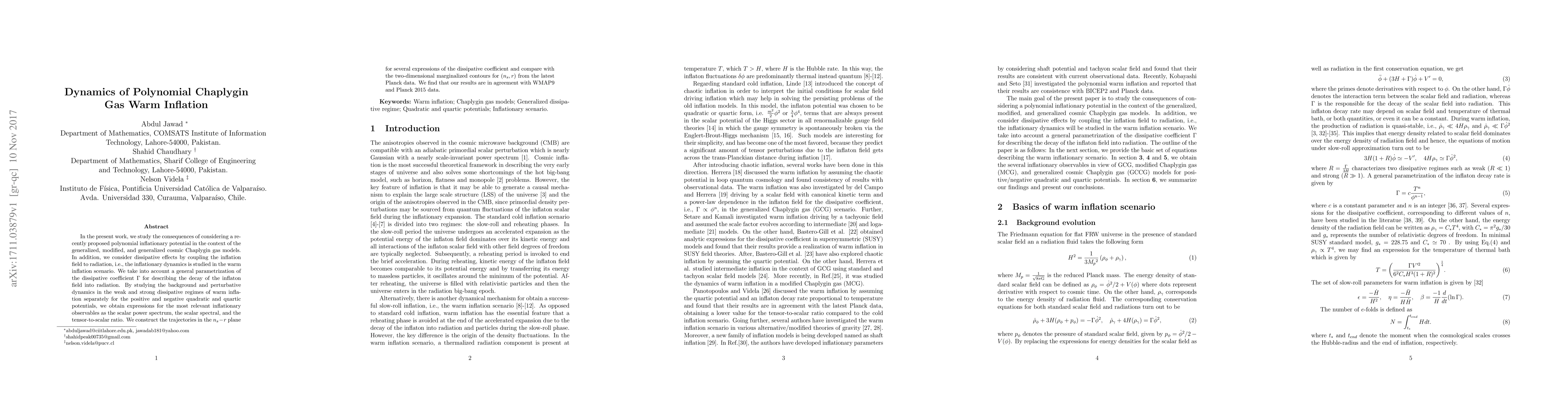 This paper investigates the dynamics of warm inflation using a polynomial Chaplygin gas model with a focus on dissipative effects. The study compares inflationary observables like the scalar power spectrum and tensor-to-scalar ratio under different potentials and dissipative regimes, finding results consistent with observational data from WMAP9 and Planck.