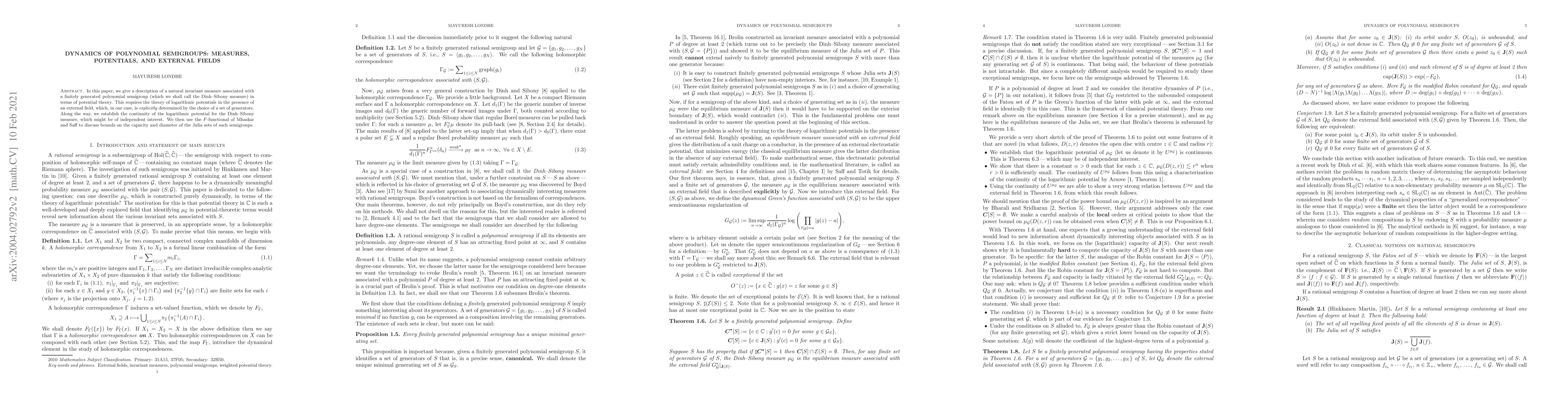 In this paper, we give a description of a natural invariant measure associated with a finitely generated polynomial semigroup (which we shall call the Dinh--Sibony measure) in terms of potential theory. This requires the theory of logarithmic potentials in the presence of an external field, which, in our case, is explicitly determined by the choice of a set of generators. Along the way, we establish the continuity of the logarithmic potential for the Dinh--Sibony measure, which might be of independent interest. We then use the $F$-functional of Mhaskar and Saff to discuss bounds on the capacity and diameter of the Julia sets of such semigroups.