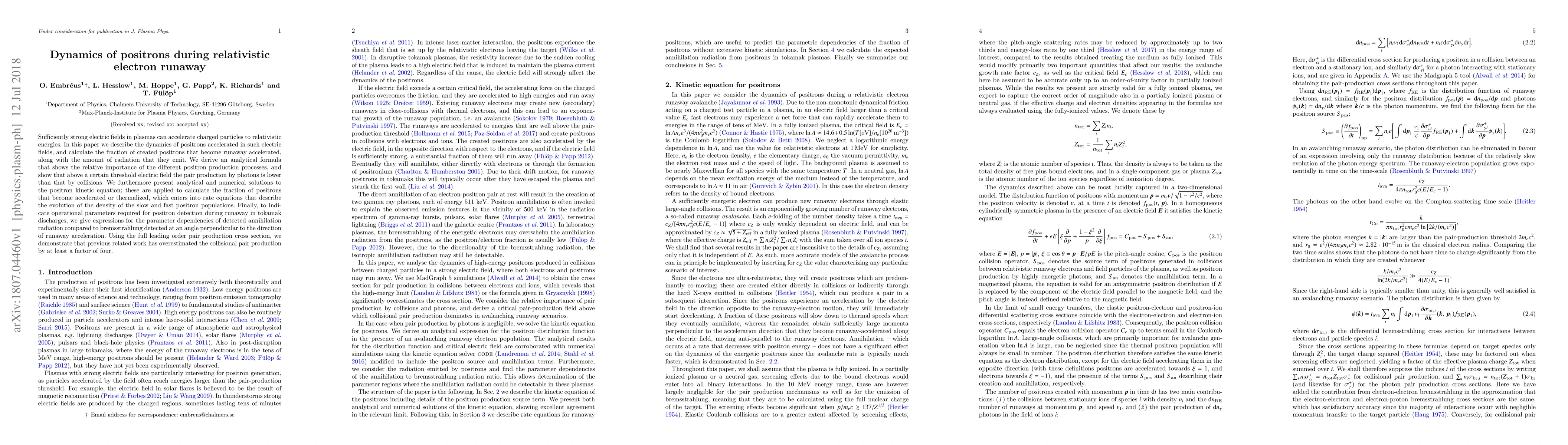 Sufficiently strong electric fields in plasmas can accelerate charged particles to relativistic energies. In this paper we describe the dynamics of positrons accelerated in such electric fields, and calculate the fraction of created positrons that become runaway accelerated, along with the amount of radiation that they emit. We derive an analytical formula that shows the relative importance of the different positron production processes, and show that above a certain threshold electric field the pair production by photons is lower than that by collisions. We furthermore present analytical and numerical solutions to the positron kinetic equation; these are applied to calculate the fraction of positrons that become accelerated or thermalized, which enters into rate equations that describe the evolution of the density of the slow and fast positron populations. Finally, to indicate operational parameters required for positron detection during runaway in tokamak discharges, we give expressions for the parameter dependencies of detected annihilation radiation compared to bremsstrahlung detected at an angle perpendicular to the direction of runaway acceleration. Using the full leading order pair production cross section, we demonstrate that previous related work has overestimated the collisional pair production by at least a factor of four.