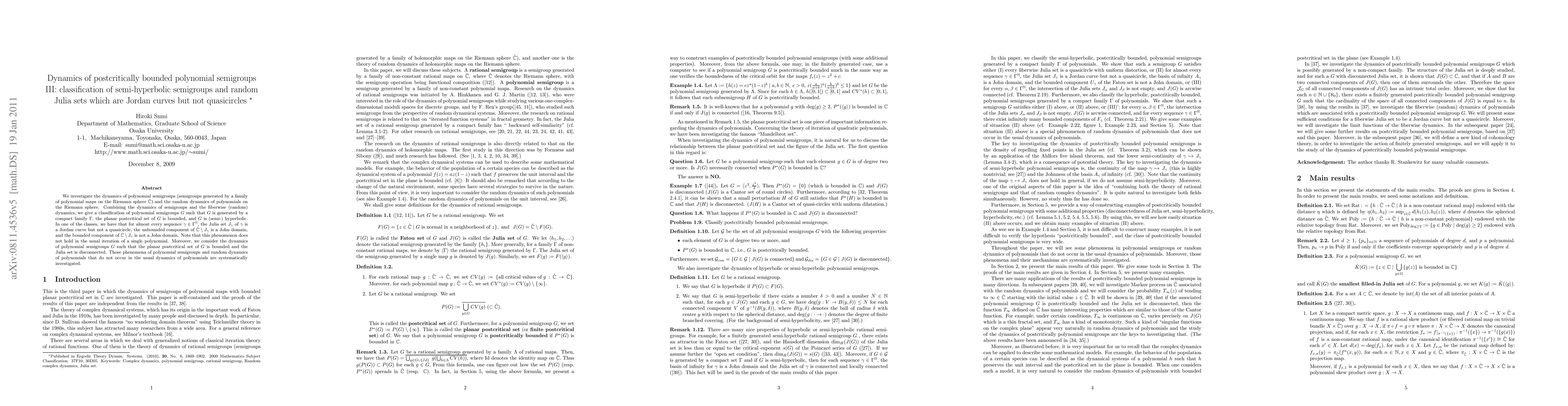 This paper classifies semi-hyperbolic polynomial semigroups with bounded postcritical sets and explores the random dynamics of polynomial semigroups, revealing that almost every sequence generates a Julia set that is a Jordan curve but not a quasicircle, unlike typical single polynomial dynamics. It also investigates the dynamics of semigroups with disconnected Julia sets.