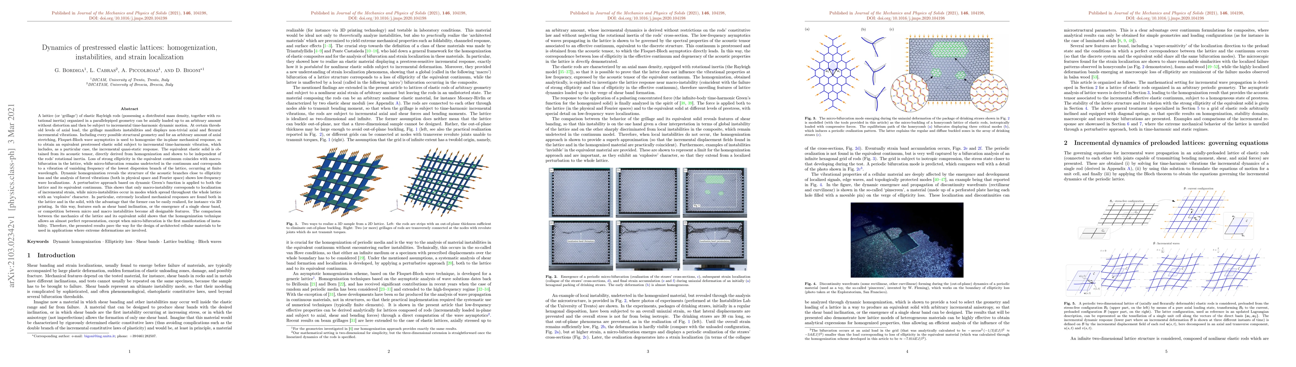 A lattice of elastic Rayleigh rods organized in a parallelepiped geometry can be axially loaded up to an arbitrary amount without distortion and then be subject to incremental time-harmonic dynamic motion. At certain threshold levels of axial load, the grillage manifests instabilities and displays non-trivial axial and flexural incremental vibrations. Floquet-Bloch wave asymptotics is used to homogenize the in-plane mechanical response, so to obtain an equivalent prestressed elastic solid subject to incremental time-harmonic vibration, which includes, as a particular case, the incremental quasi-static response. The equivalent elastic solid is obtained from its acoustic tensor, directly derived from homogenization and shown to be independent of the rods' rotational inertia. Loss of strong ellipticity in the equivalent continuum coincides with macro-bifurcation in the lattice, while micro-bifurcation remains undetected in the continuum and corresponds to a vibration of vanishing frequency of the lowest dispersion branch of the lattice, occurring at finite wavelength. A perturbative approach based on dynamic Green's function is applied to both the lattice and its equivalent continuum. This shows that only macro-instability corresponds to localization of incremental strain, while micro-instabilities occur in modes that spread throughout the whole lattice with an 'explosive' character. Extremely localized mechanical responses are found both in the lattice and in the solid, with the advantage that the former can be easily realized, for instance via 3D printing. In this way, features such as shear band inclination, or the emergence of a single shear band, or competition between micro and macro instabilities become all designable features. The presented results pave the way for the design of architected materials to be used in applications involving extreme deformations.