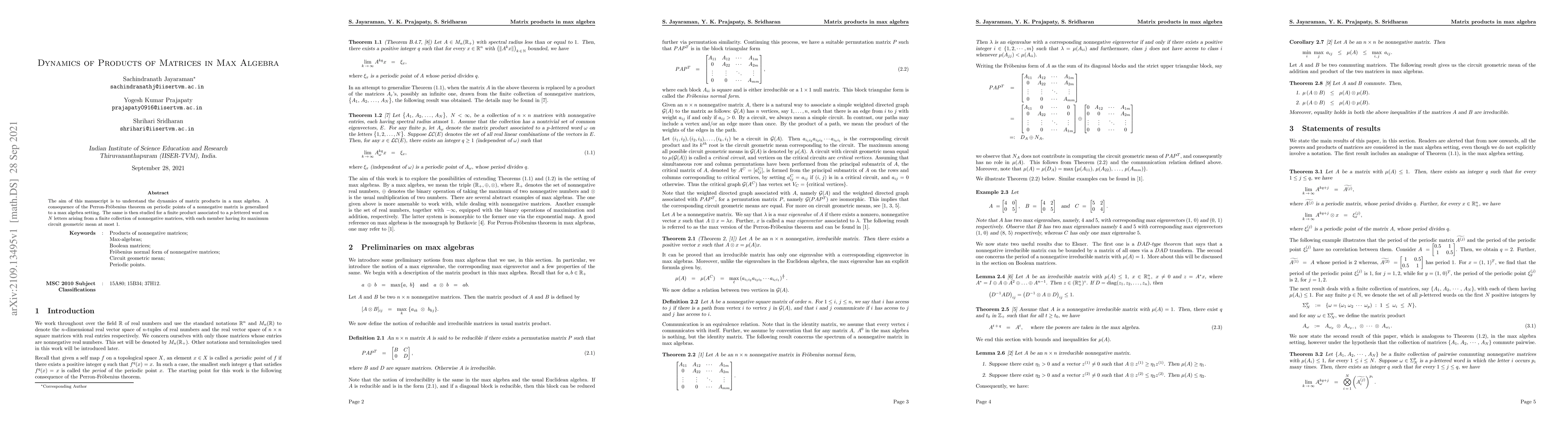 This paper investigates the dynamics of matrix products within max algebra, extending the Perron-Frobenius theorem to this setting and analyzing the behavior of finite products derived from nonnegative matrices with circuit geometric means not exceeding 1.