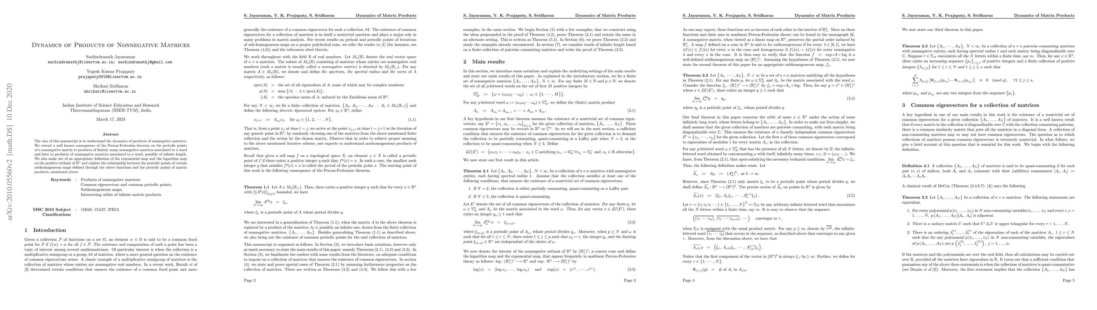 The aim of this manuscript is to understand the dynamics of products of nonnegative matrices. We extend a well known consequence of the Perron-Frobenius theorem on the periodic points of a nonnegative matrix to products of finitely many nonnegative matrices associated to a word and later to products of nonnegative matrices associated to a word, possibly of infinite length. We also make use of an appropriate definition of the exponential map and the logarithm map on the positive orthant of $\mathbb{R}^{n}$ and explore the relationship between the periodic points of certain subhomogeneous maps defined through the above functions and the periodic points of matrix products, mentioned above.