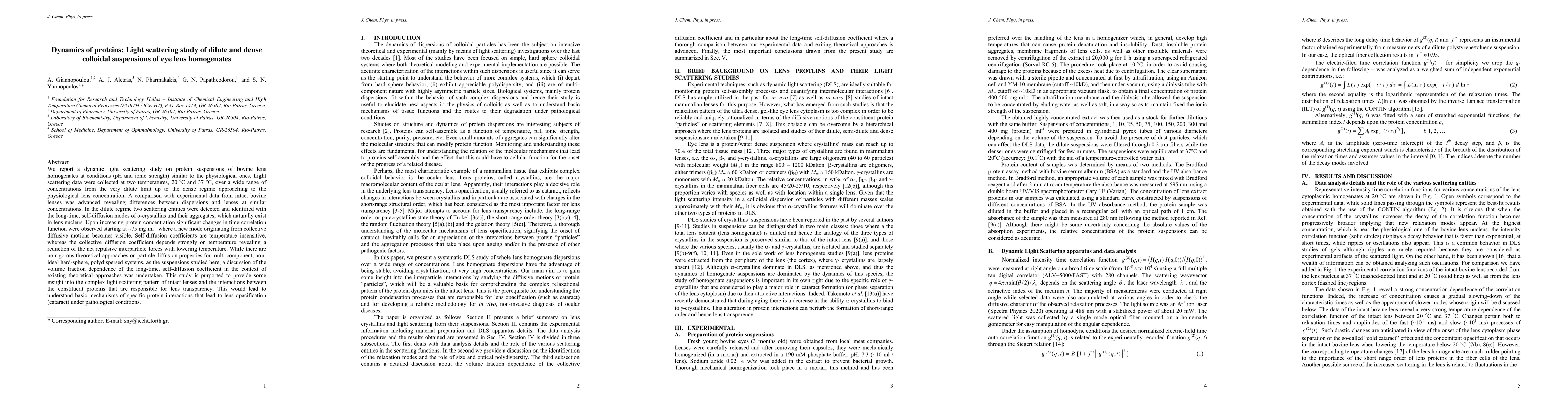 Researchers studied protein suspensions from bovine lens homogenates using dynamic light scattering to understand protein interactions that affect lens transparency. They found differences in dispersions and intact lenses at similar concentrations, with temperature influencing collective diffusion coefficient.