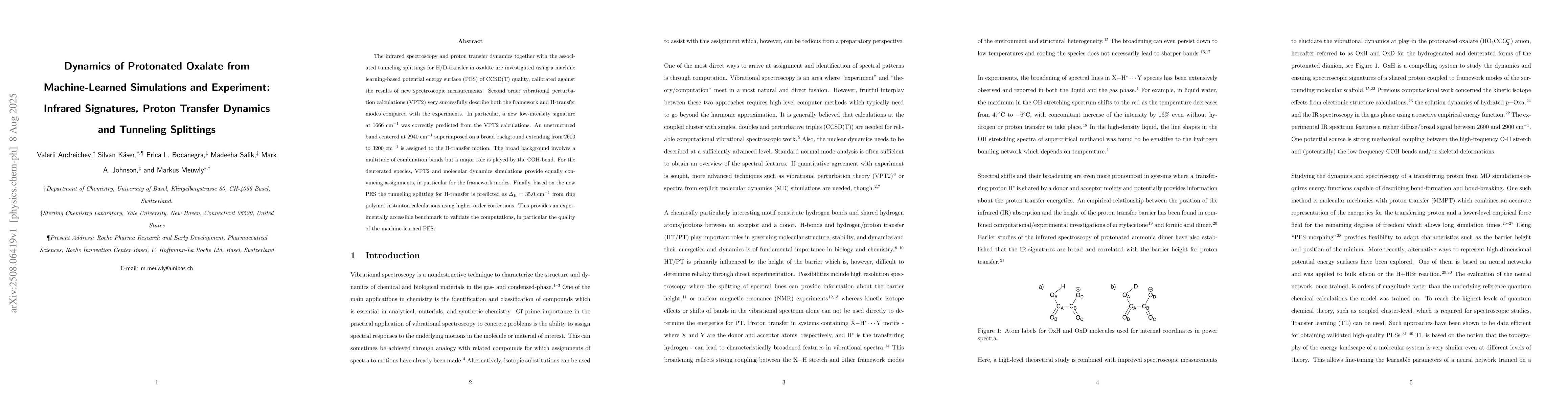 The infrared spectroscopy and proton transfer dynamics together with the associated tunneling splittings for H/D-transfer in oxalate are investigated using a machine learning-based potential energy surface (PES) of CCSD(T) quality, calibrated against the results of new spectroscopic measurements. Second order vibrational perturbation calculations (VPT2) very successfully describe both the framework and H-transfer modes compared with the experiments. In particular, a new low-intensity signature at 1666 cm$^{-1}$ was correctly predicted from the VPT2 calculations. An unstructured band centered at 2940 cm$^{-1}$ superimposed on a broad background extending from 2600 to 3200 cm$^{-1}$ is assigned to the H-transfer motion. The broad background involves a multitude of combination bands but a major role is played by the COH-bend. For the deuterated species, VPT2 and molecular dynamics simulations provide equally convincing assignments, in particular for the framework modes. Finally, based on the new PES the tunneling splitting for H-transfer is predicted as $\Delta_{\rm H} = 35.0$ cm$^{-1}$ from ring polymer instanton calculations using higher-order corrections. This provides an experimentally accessible benchmark to validate the computations, in particular the quality of the machine-learned PES.