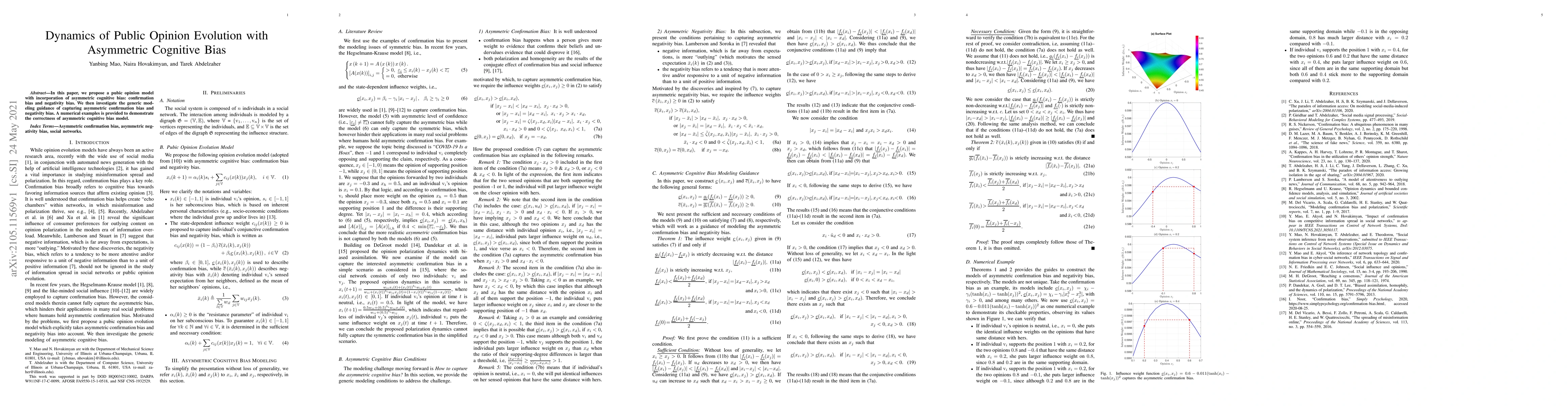 In this paper, we propose a pubic opinion model with incorporation of asymmetric cognitive bias: confirmation bias and negativity bias. We then investigate the generic modeling guidance of capturing asymmetric confirmation bias and negativity bias. A numerical examples is provided to demonstrate the correctness of asymmetric cognitive bias model.