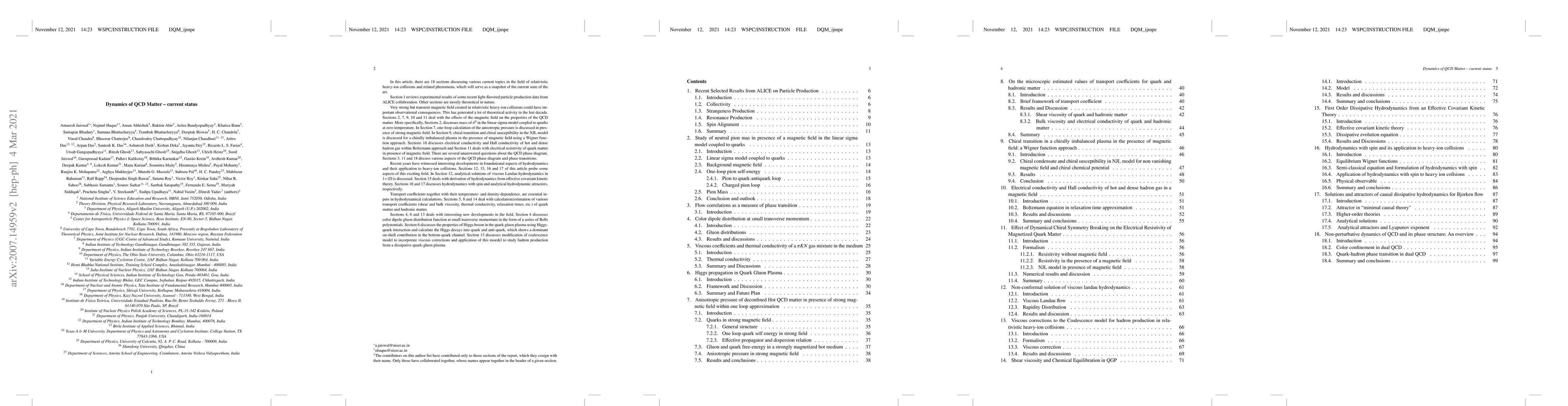In this article, there are 18 sections discussing various current topics in the field of relativistic heavy-ion collisions and related phenomena, which will serve as a snapshot of the current state of the art. Section 1 reviews experimental results of some recent light-flavored particle production data from ALICE collaboration. Other sections are mostly theoretical in nature. Very strong but transient magnetic field created in relativistic heavy-ion collisions could have important observational consequences. This has generated a lot of theoretical activity in the last decade. Sections 2, 7, 9, 10 and 11 deal with the effects of the magnetic field on the properties of the QCD matter. There are several unanswered questions about the QCD phase diagram. Sections 3, 11 and 18 discuss various aspects of the QCD phase diagram and phase transitions. Recent years have witnessed interesting developments in foundational aspects of hydrodynamics and their application to heavy-ion collisions. Sections 12, 15, 16 and 17 of this article probe some aspects of this exciting field. Transport coefficients together with their temperature- and density-dependence, are essential inputs in hydrodynamical calculations. Sections 5, 8 and 14 deal with calculation/estimation of various transport coefficients (shear and bulk viscosity, thermal conductivity, relaxation times, etc.) of quark matter and hadronic matter. Sections 4, 6 and 13 deals with interesting new developments in the field. Section 4 discusses color dipole gluon distribution function at small transverse momentum in the form of a series of Bells polynomials. Section 6 discusses the properties of Higgs boson in the quark gluon plasma using Higgs-quark interaction. Section 13 discusses modification of coalescence model to incorporate viscous corrections and application of this model.