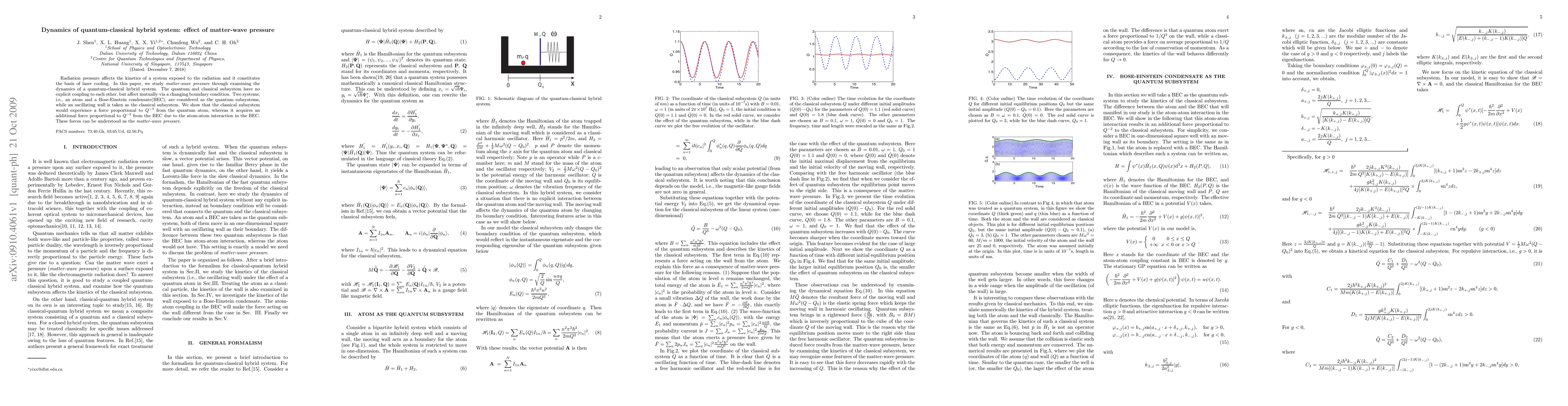 This paper investigates the dynamics of a quantum-classical hybrid system, focusing on the concept of matter-wave pressure. It reveals that an oscillating wall (classical subsystem) experiences forces from quantum subsystems (atom and Bose-Einstein condensate) due to changing boundary conditions, with specific pressure-like forces proportional to $Q^{-3}$ and $Q^{-2}$ respectively.