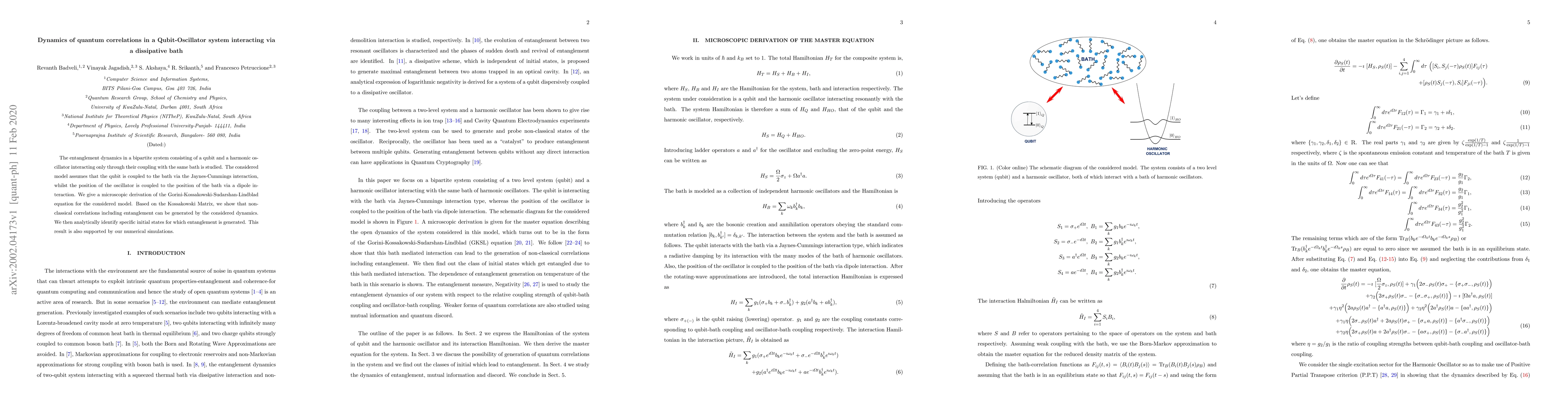 This paper studies the dynamics of quantum correlations in a qubit-oscillator system interacting through a dissipative bath, deriving a Gorini-Kossakowski-Sudarshan-Lindblad equation. It demonstrates that non-classical correlations, including entanglement, can be generated under specific initial conditions, supported by both analytical and numerical analyses.