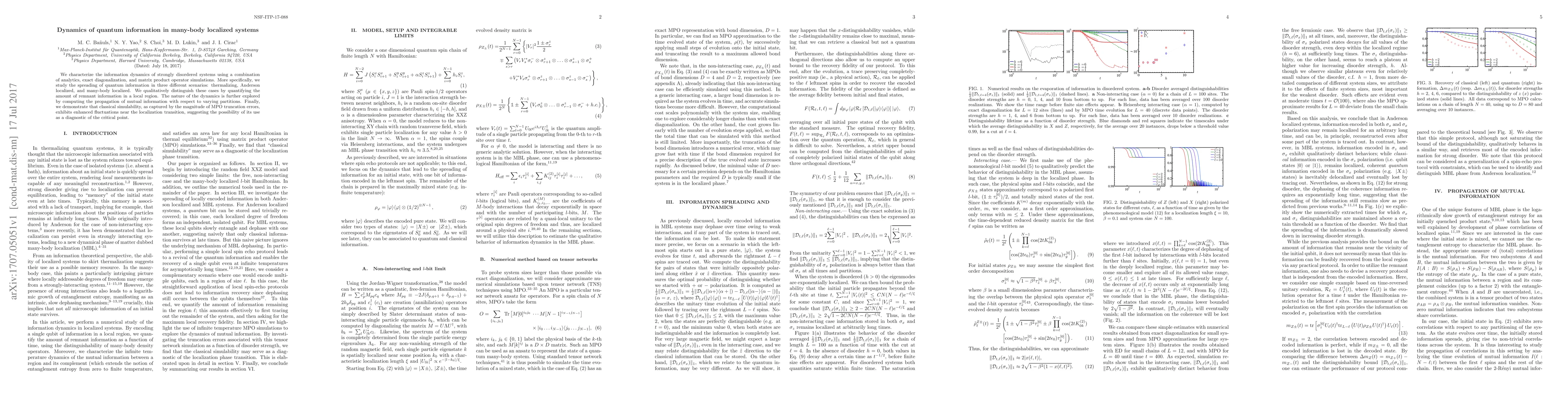This paper investigates the dynamics of quantum information in strongly disordered systems through analytics, exact diagonalization, and matrix product operator simulations. It distinguishes thermalizing, Anderson localized, and many-body localized states by measuring remnant information and mutual information, and finds enhanced fluctuations in classical simulability near the localization transition.