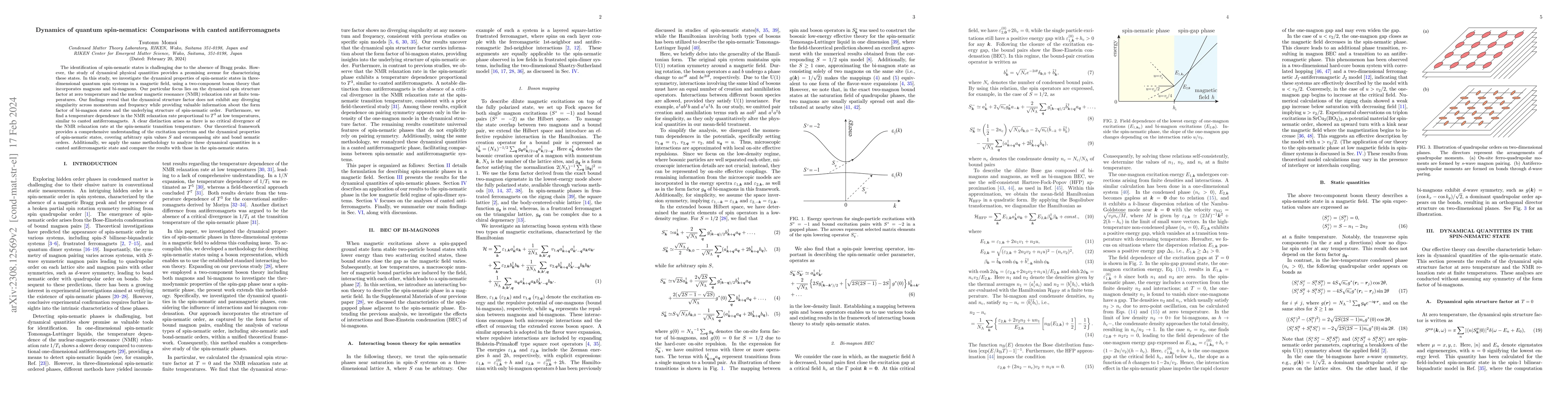 This paper explores the dynamical properties of quantum spin-nematic states using a two-component boson theory, focusing on the dynamical spin structure factor and NMR relaxation rate. It finds no diverging singularity in the dynamical structure factor, revealing insights into bi-magnon states and spin-nematic order, and observes a $T^3$ temperature dependence in NMR relaxation akin to canted antiferromagnets, without critical divergence at the transition temperature.