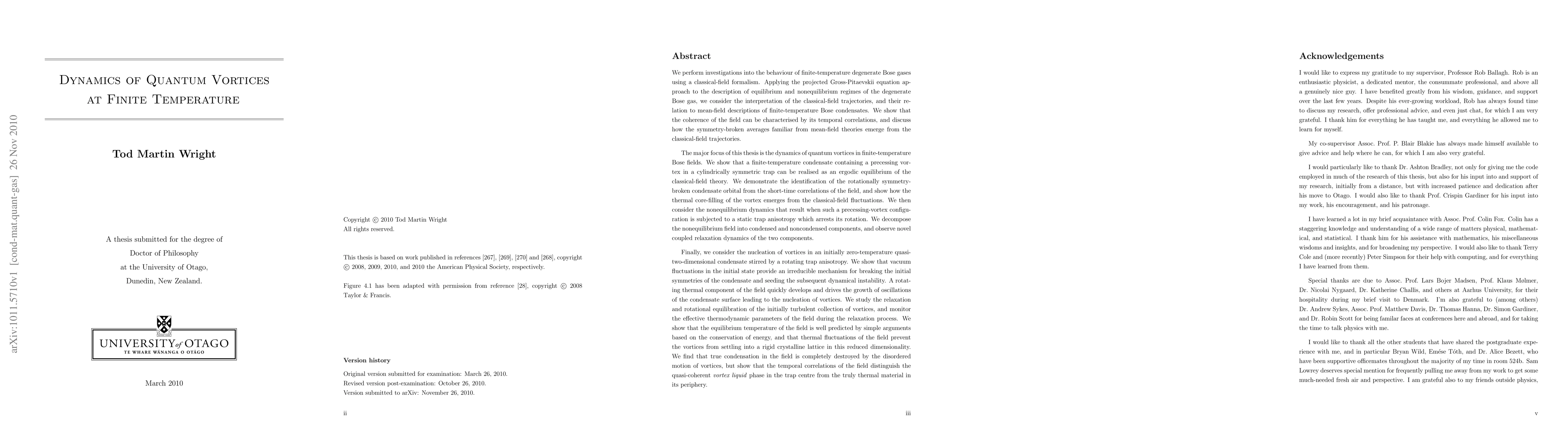 In this thesis, we perform investigations into the behaviour of finite-temperature degenerate Bose gases using a classical-field formalism, focussing in particular on the dynamics of quantum vortices in these systems. We demonstrate that the coherence of the classical field can be characterised by its temporal correlations, and discuss how the phase-symmetry-broken averages familiar from mean-field theories emerge from the field trajectories. We show that a finite-temperature condensate containing a precessing vortex in a cylindrically symmetric trap can be realised as an ergodic equilibrium of the classical-field theory, and demonstrate the identification of the rotationally symmetry-broken condensate orbital and core-filling thermal component from the field correlations. We then consider the nonequilibrium dynamics that result when such a precessing-vortex configuration is subjected to a static trap anisotropy which arrests its rotation, and observe novel coupled relaxation dynamics of the condensed and noncondensed components of the field. Finally, we consider the nucleation of vortices in an initially zero-temperature quasi-two-dimensional condensate stirred by a rotating trap anisotropy. We quantify the emergence of a rotating thermal component of the field, which drives the nucleation of vortices from condensate-surface oscillations, and study the relaxation and rotational equilibration of the initially turbulent collection of vortices. We find that thermal fluctuations of the field prevent the vortices from settling into a rigid crystalline lattice in this reduced dimensionality, and that true condensation in the field is completely destroyed by the disordered motion of vortices. We show, however, that the temporal correlations of the field distinguish the quasi-coherent vortex-liquid phase in the trap centre from the truly thermal material in its periphery.