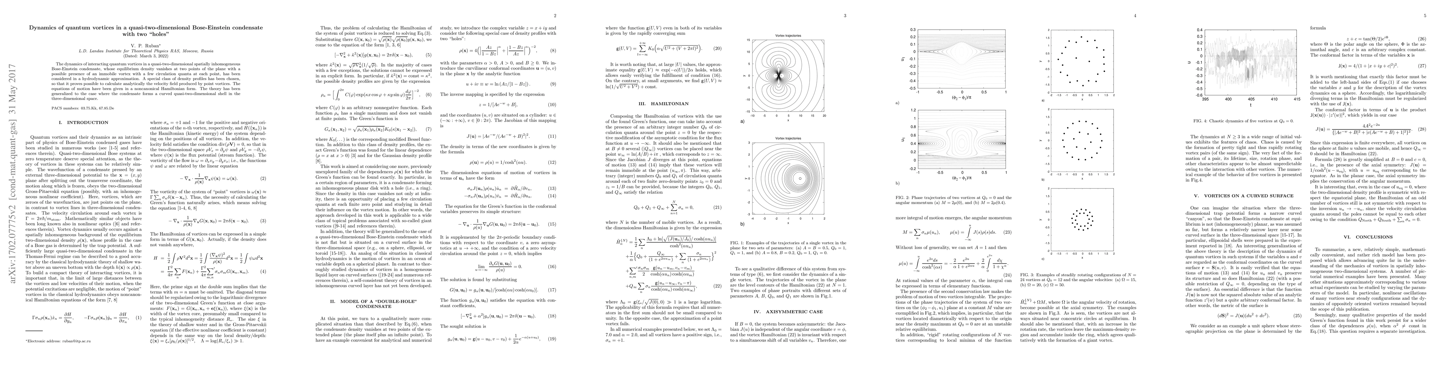 This paper investigates the dynamics of quantum vortices in a quasi-two-dimensional Bose-Einstein condensate with two "holes," using a hydrodynamic approximation. Analytical solutions for the velocity field generated by point vortices are derived, and the theory is extended to condensates forming curved shells in three-dimensional space.