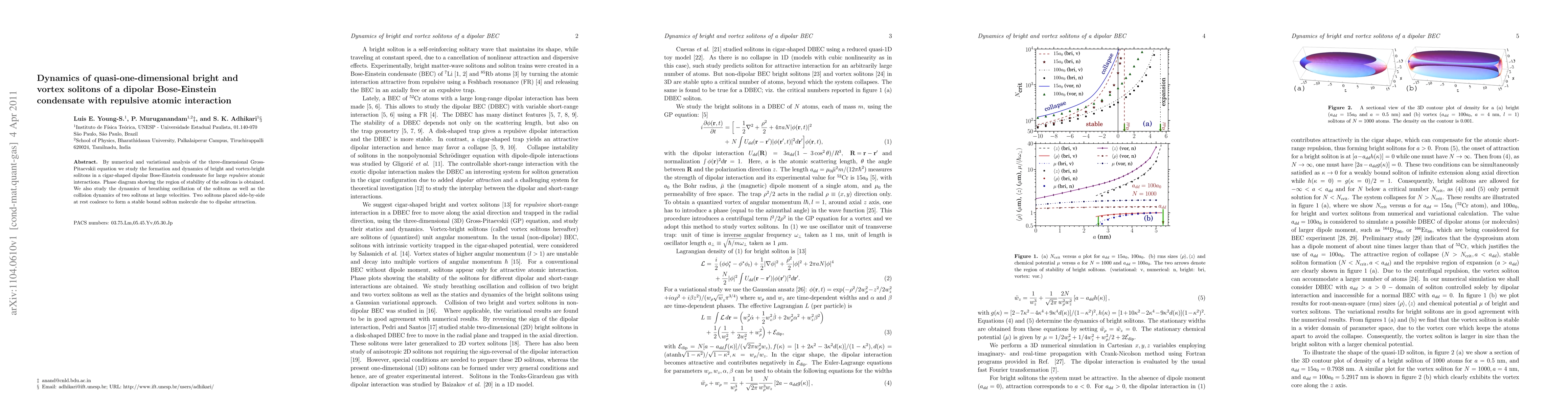 This paper investigates the dynamics of bright and vortex solitons in a dipolar Bose-Einstein condensate under strong repulsive atomic interactions, revealing their stability regions and collision behaviors. The study also finds that two solitons can form a stable bound molecule due to dipolar attraction.