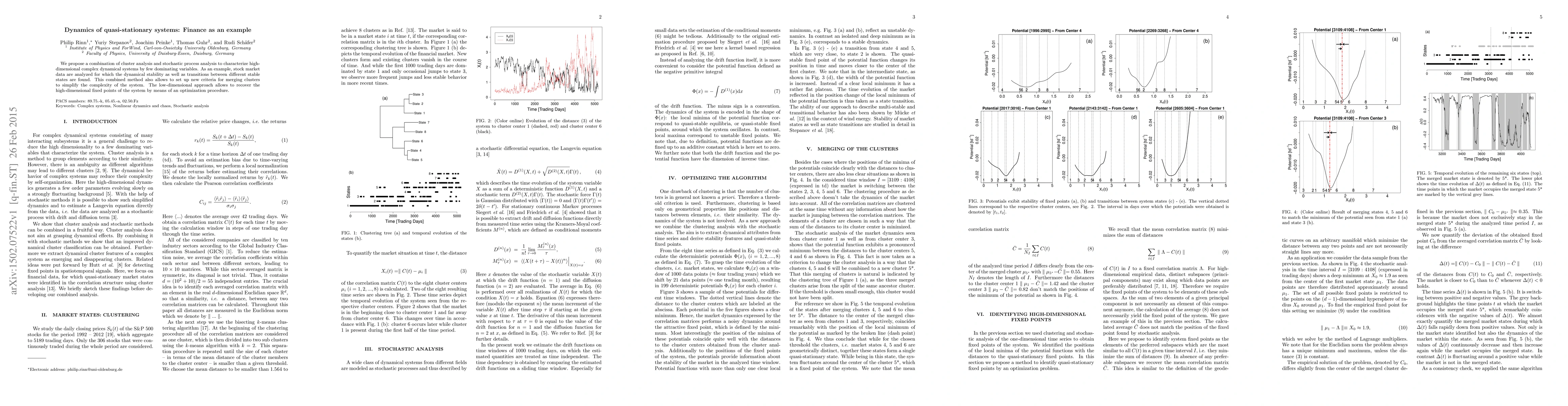 We propose a combination of cluster analysis and stochastic process analysis to characterize high-dimensional complex dynamical systems by few dominating variables. As an example, stock market data are analyzed for which the dynamical stability as well as transitions between different stable states are found. This combined method also allows to set up new criteria for merging clusters to simplify the complexity of the system. The low-dimensional approach allows to recover the high-dimensional fixed points of the system by means of an optimization procedure.