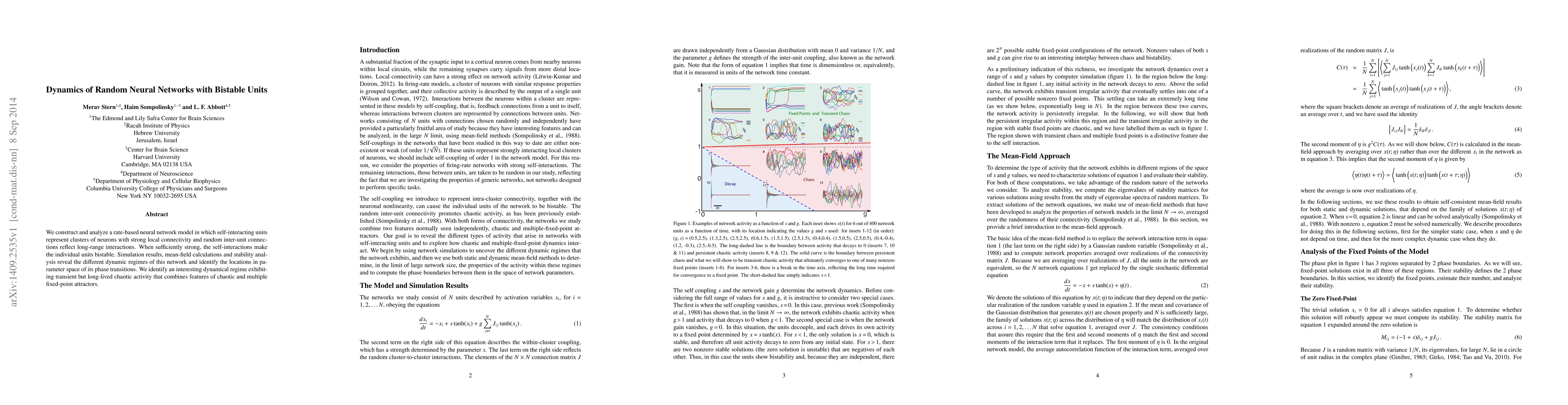 We construct and analyze a rate-based neural network model in which self-interacting units represent clusters of neurons with strong local connectivity and random inter-unit connections reflect long-range interactions. When sufficiently strong, the self-interactions make the individual units bistable. Simulation results, mean-field calculations and stability analysis reveal the different dynamic regimes of this network and identify the locations in parameter space of its phase transitions. We identify an interesting dynamical regime exhibiting transient but long-lived chaotic activity that combines features of chaotic and multiple fixed-point attractors.