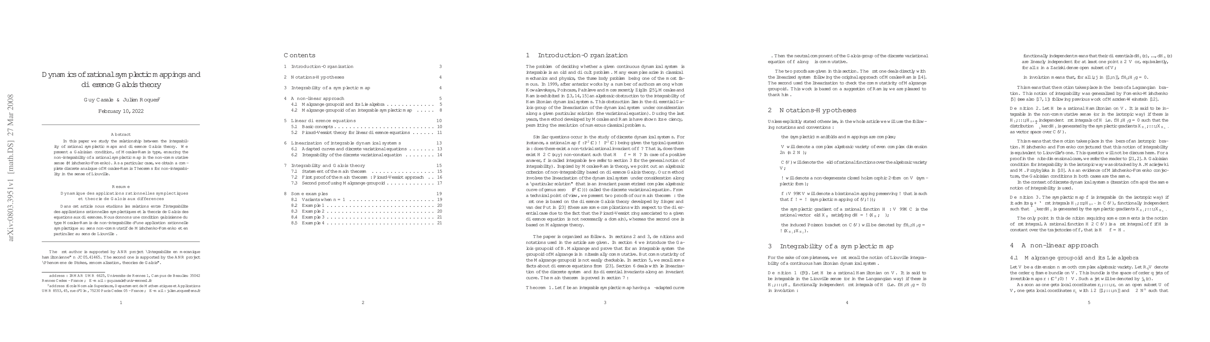 This research contributes to understanding the dynamics of rational symplectic mappings by linking their integrability to difference Galois theory, providing a novel approach to non-integrability conditions.