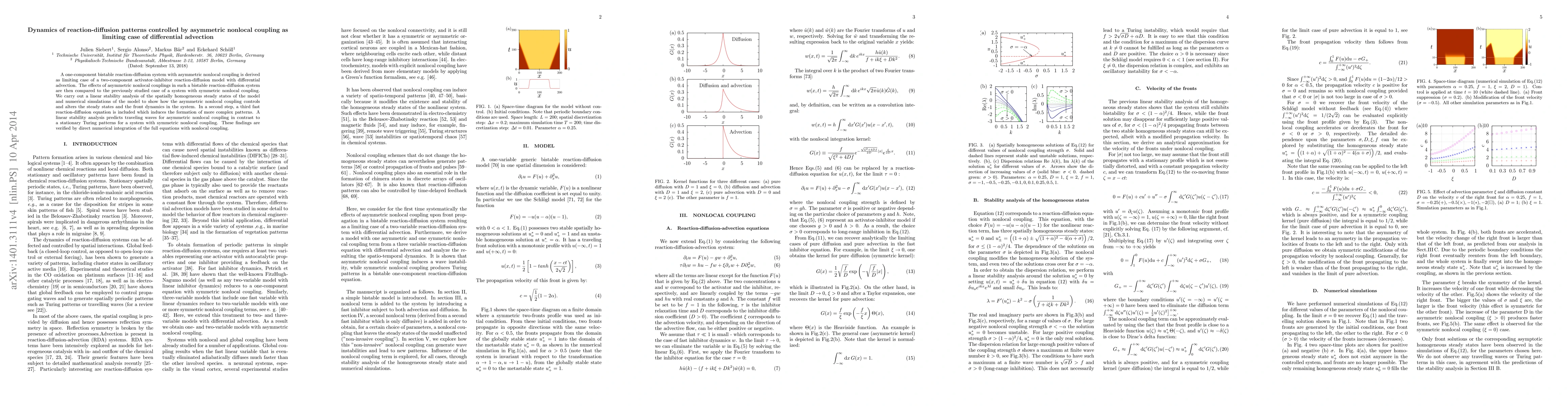 A one-component bistable reaction-diffusion system with asymmetric nonlocal coup ling is derived as limiting case of a two-component activator-inhibitor reaction -diffusion model with differential advection. The effects of asymmetric nonlocal couplings in such a bistable reaction-diffusi on system are then compared to the previously studied case of a system with symm etric nonlocal coupling. We carry out a linear stability analysis of the spatially homogeneous steady sta tes of the model and numerical simulations of the model to show how the asymmetr ic nonlocal coupling controls and alters the steady states and the front dynamic s in the system. In a second step, a third fast reaction-diffusion equation is included which ind uces the formation of more complex patterns. A linear stability analysis predicts traveling waves for asymmetric nonlocal coupling in contrast to a stationary Turing patterns for a system with symmetric nonlocal coupling. These findings are verified by direct numerical integration of the full equations with nonlocal coupling.