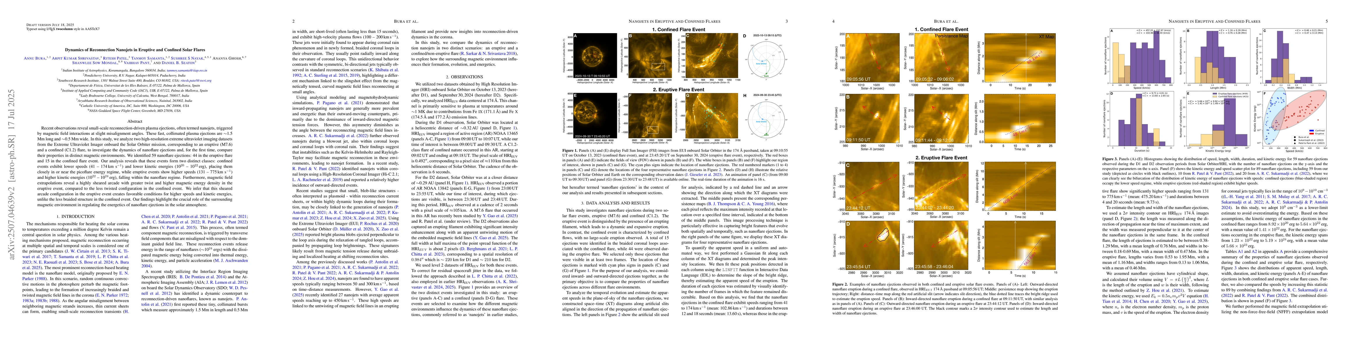 Recent observations reveal small-scale reconnection-driven plasma ejections, often termed nanojets, triggered by magnetic field interactions at slight misalignment angles. These fast, collimated plasma ejections are $\sim$1.5 Mm long and $\sim$0.5 Mm wide. In this study, we analyze two high-resolution extreme ultraviolet imaging datasets from the Extreme Ultraviolet Imager onboard the Solar Orbiter mission, corresponding to an eruptive (M7.6) and a confined (C1.2) flare, to investigate the dynamics of nanoflare ejections and, for the first time, compare their properties in distinct magnetic environments. We identified 59 nanoflare ejections: 44 in the eruptive flare and 15 in the confined flare event. Our analysis reveals that these events form two distinct classes: confined events exhibit lower speeds (41--174 kms$^{-1}$) and lower kinetic energies ($10^{20}$--$10^{22}$ erg), placing them closely in or near the picoflare energy regime, while eruptive events show higher speeds (131--775 kms$^{-1}$) and higher kinetic energies ($10^{22}$--$10^{24}$ erg), falling within the nanoflare regime. Furthermore, magnetic field extrapolations reveal a highly sheared arcade with greater twist and higher magnetic energy density in the eruptive event, compared to the less twisted configuration in the confined event. We infer that this sheared arcade configuration in the eruptive event creates favorable conditions for higher speeds and kinetic energies, unlike the less braided structure in the confined event. Our findings highlight the crucial role of the surrounding magnetic environment in regulating the energetics of nanoflare ejections in the solar atmosphere.