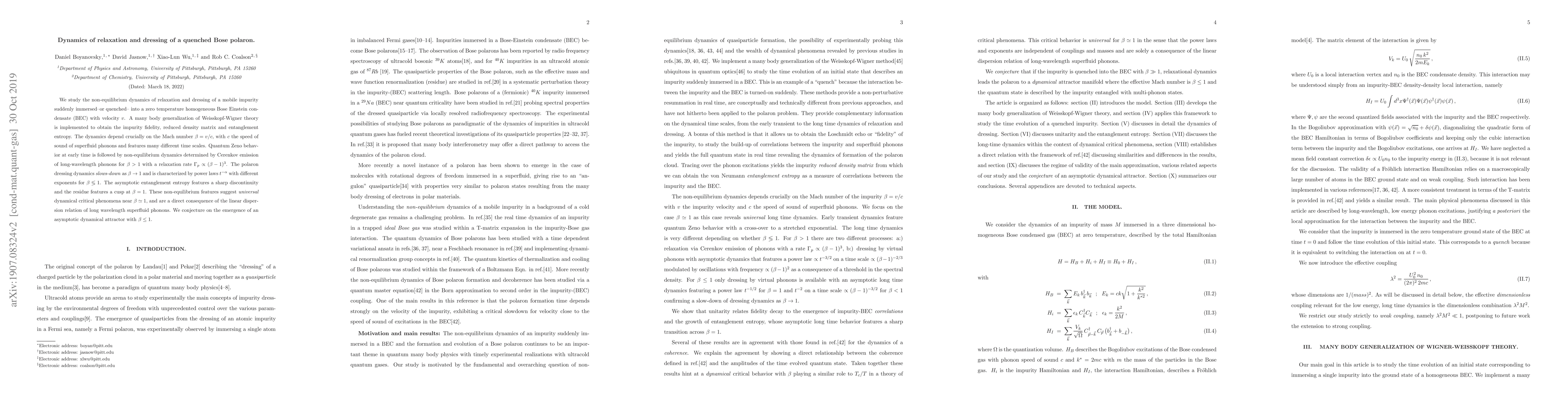 We study the non-equilibrium dynamics of relaxation and dressing of a mobile impurity suddenly immersed--or quenched-- into a zero temperature homogeneous Bose Einstein condensate (BEC) with velocity $v$. A many body generalization of Weisskopf-Wigner theory is implemented to obtain the impurity fidelity, reduced density matrix and entanglement entropy. The dynamics depend crucially on the Mach number $\beta =v/c$, with $c$ the speed of sound of superfluid phonons and features many different time scales. Quantum Zeno behavior at early time is followed by relaxational and dressing dynamics determined by Cerenkov emission of long-wavelength phonons for $\beta >1$ with a decay rate $\Gamma_p \propto (\beta-1)^3$. The polaron dressing dynamics \emph{slows-down} as $\beta \rightarrow 1$ and is characterized by power laws $t^{-\alpha}$ with different exponents for $\beta \lessgtr 1$. The asymptotic entanglement entropy features a sharp discontinuity and the residue features a cusp at $\beta =1$. These non-equilibrium features suggest \emph{universal} dynamical critical phenomena near $\beta \simeq 1$, and are a direct consequence of the linear dispersion relation of long wavelength superfluid phonons. We conjecture on the emergence of an asymptotic dynamical attractor with $\beta \leq 1$.