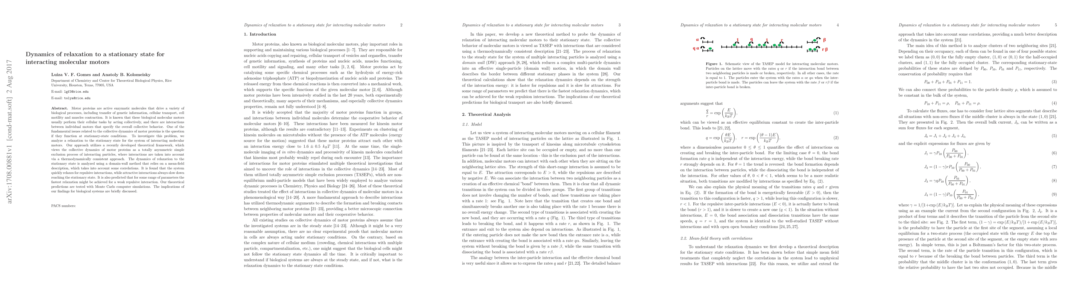 This paper investigates the dynamics of relaxation to a stationary state in systems of interacting molecular motors using a theoretical framework based on a totally asymmetric simple exclusion process. The study finds that repulsive interactions lead to faster relaxation, while attractive interactions slow it down, with weak repulsive interactions potentially optimizing the speed of relaxation.
