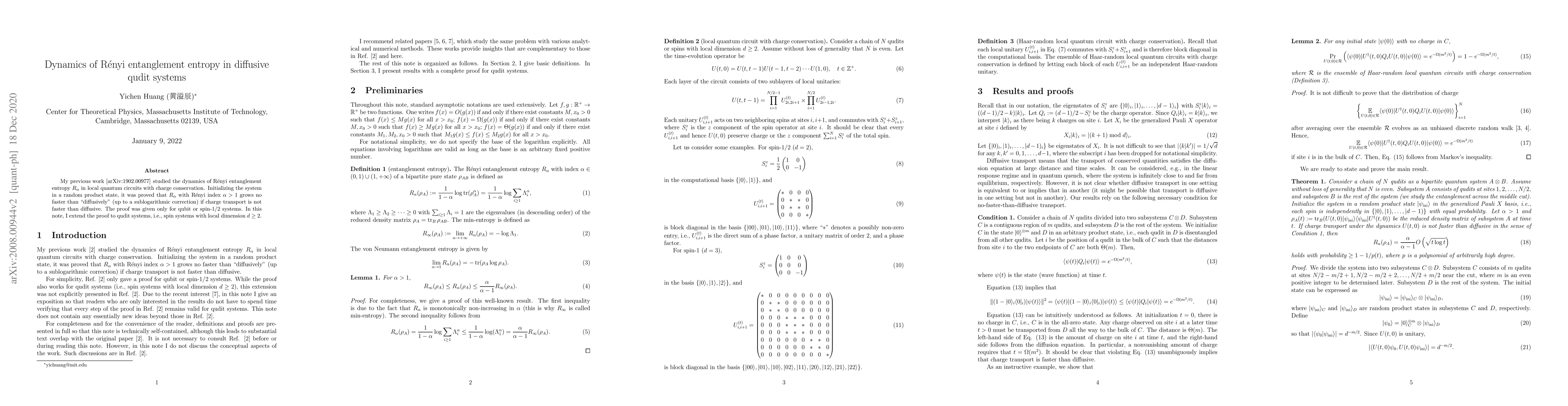 This paper extends the dynamics of R\'enyi entanglement entropy $R_\alpha$ in diffusive quantum systems to qudit systems, proving that $R_\alpha$ grows no faster than diffusively when charge transport is not faster than diffusive, generalizing previous results for qubit systems to systems with higher local dimensions.