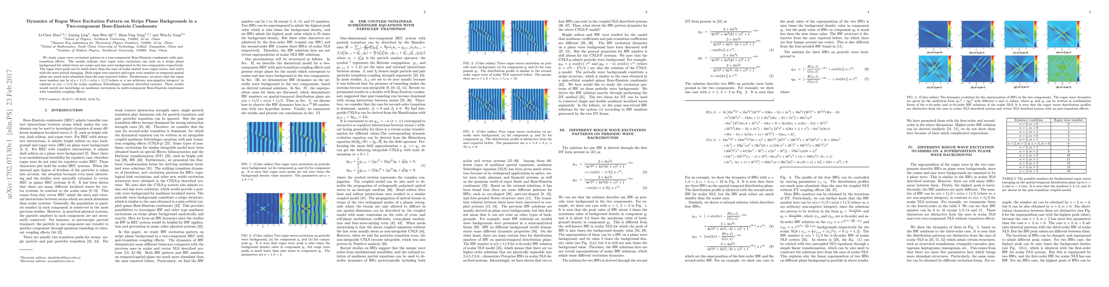 We study rogue wave excitation pattern in a two-component Bose-Einstein condensate with pair-transition effects. The results indicate that rogue wave excitation can exist on a stripe phase background for which there are cosine and sine wave background in the two components respectively. The rogue wave peak can be much lower than the ones of scalar matter wave rogue waves, and varies with the wave period changing. Both rogue wave pattern and rogue wave number on temporal-spatial plane are much more abundant than the ones reported before. Furthermore, we prove that the rogue wave number can be $n (n+1)/2+m (m+1)/2$ (where $m,n $ are arbitrary non-negative integers), in contrast to $n(n+1)/2$ for scalar nonlinear Schr\"{o}dinger equation described systems. These results would enrich our knowledge on nonlinear excitations in multi-component Bose-Einstein condensate with transition coupling effects.
