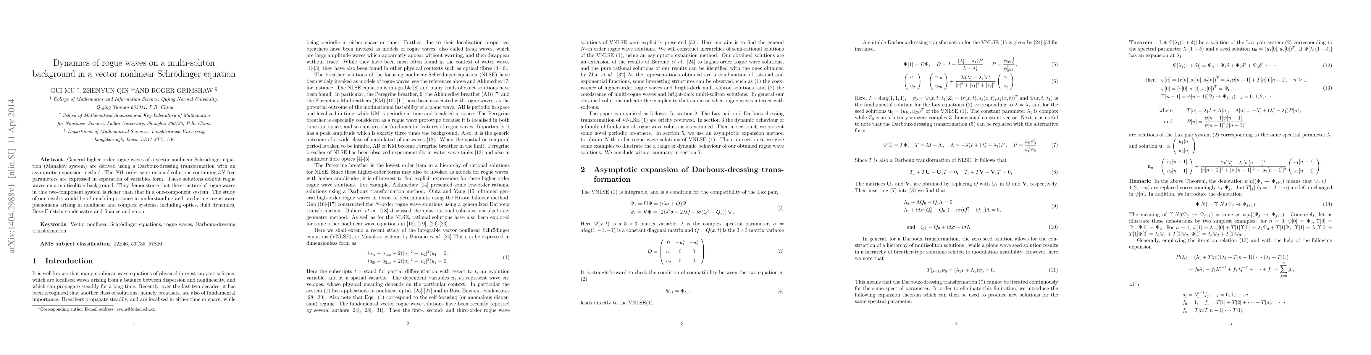 This paper derives higher order rogue waves in a vector nonlinear Schrödinger equation (Manakov system) using a Darboux-dressing transformation and asymptotic expansion. The solutions reveal complex rogue wave structures on a multi-soliton background, highlighting the richer dynamics in two-component systems compared to one-component systems.