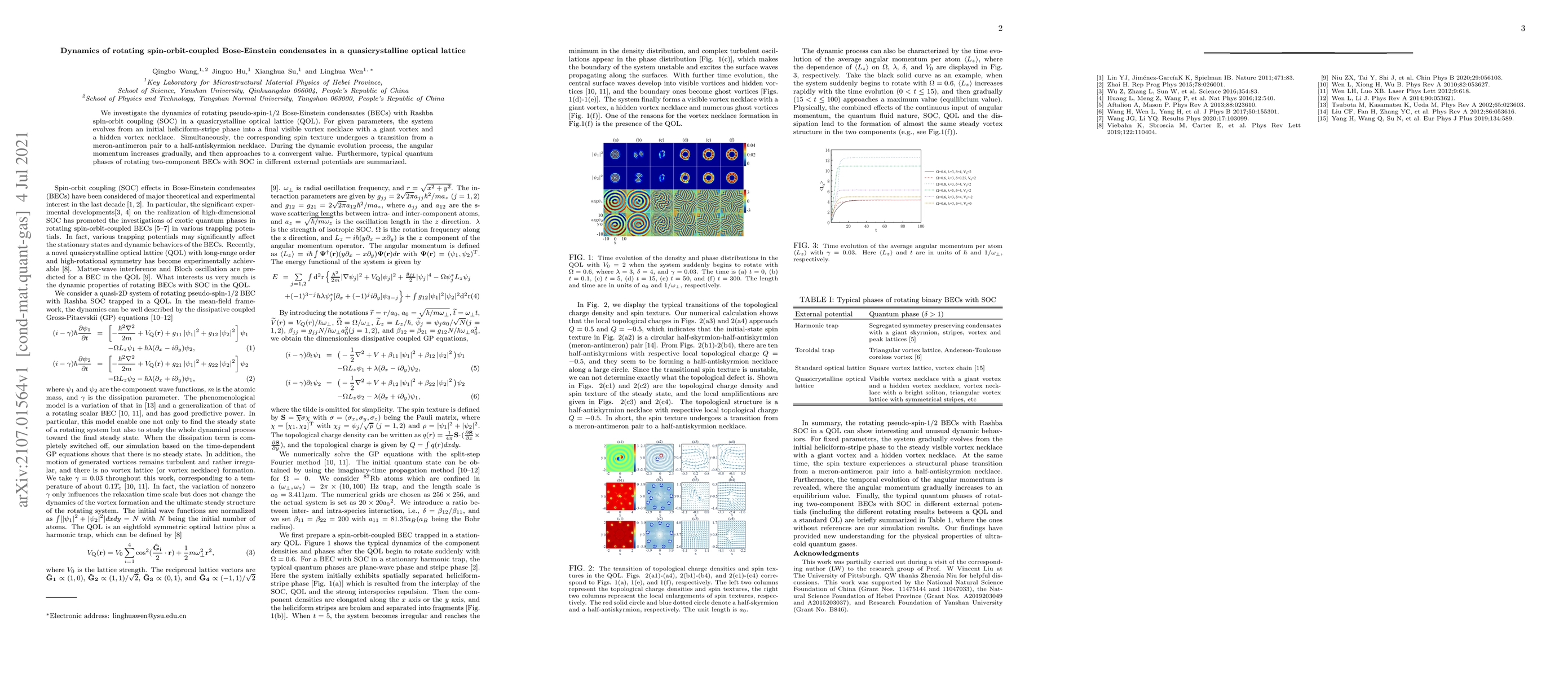This paper explores the dynamics of rotating spin-orbit-coupled Bose-Einstein condensates in a quasicrystalline optical lattice, revealing an evolution from an initial heliciform-stripe phase to a final visible vortex necklace, accompanied by a transition in spin texture and gradual convergence of angular momentum. The study also summarizes quantum phases of such systems under various external potentials.