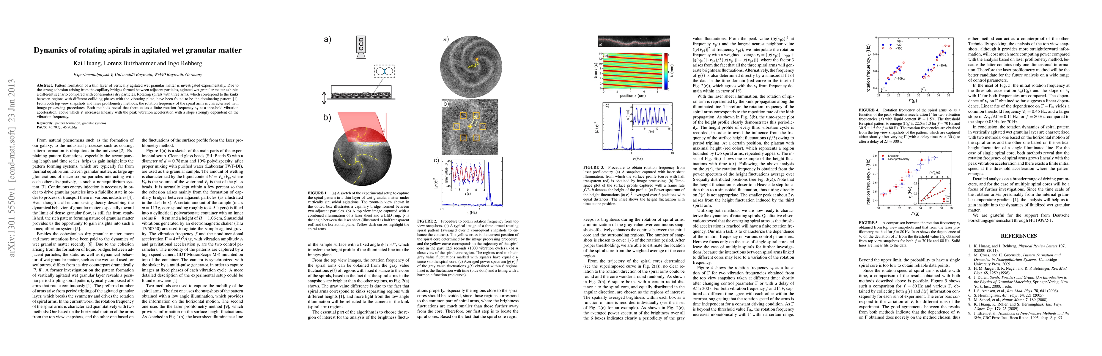 This study investigates the pattern formation in vertically agitated wet granular matter, revealing rotating spirals with three arms driven by capillary forces. The rotation frequency of these spirals increases linearly with peak vibration acceleration above a threshold, with the slope of this increase strongly dependent on vibration frequency.