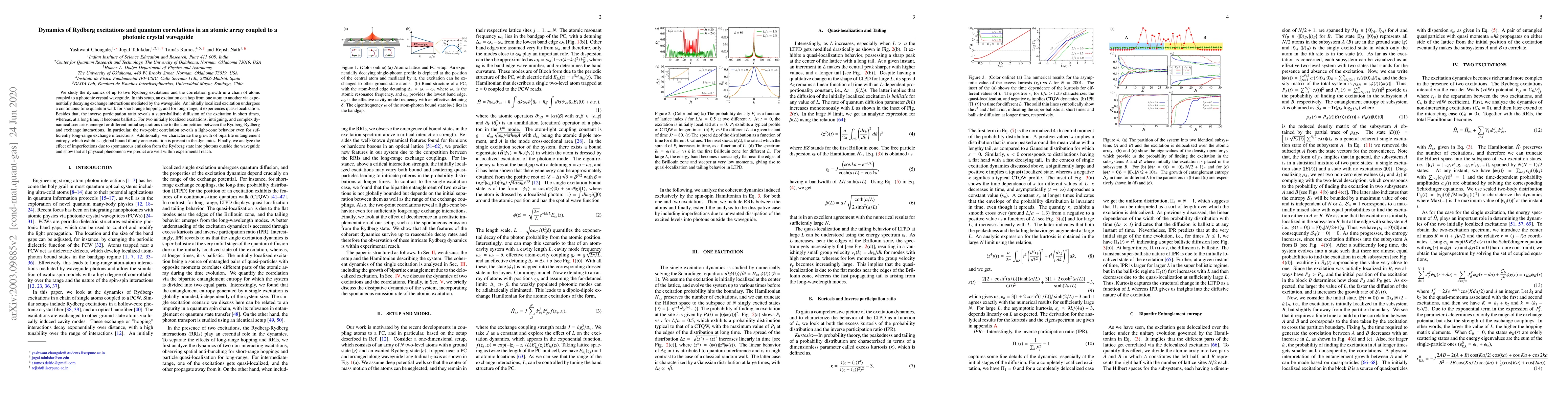 We study the dynamics of up to two Rydberg excitations and the correlation growth in a chain of atoms coupled to a photonic crystal waveguide. In this setup, an excitation can hop from one atom to another via exponentially decaying exchange interactions mediated by the waveguide. An initially localized excitation undergoes a continuous-time quantum walk for short-range hopping, and for long-range, it experiences quasi-localization. Besides that, the inverse participation ratio reveals a super-ballistic diffusion of the excitation in short times, whereas, at a long time, it becomes ballistic. For two initially localized excitations, intriguing, and complex dynamical scenarios emerge for different initial separations due to the competition between the Rydberg-Rydberg and exchange interactions. In particular, the two-point correlation reveals a light-cone behavior even for sufficiently long-range exchange interactions. Additionally, we characterize the growth of bipartite entanglement entropy, which exhibits a global bound if only one excitation is present in the dynamics. Finally, we analyze the effect of imperfections due to spontaneous emission from the Rydberg state into photons outside the waveguide and show that all physical phenomena we predict are well within experimental reach.