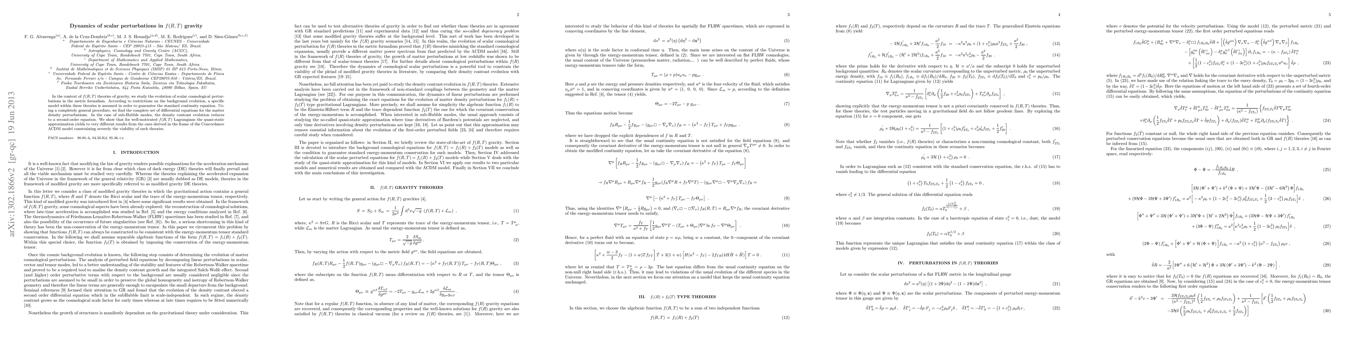 This paper investigates the dynamics of scalar perturbations in f(R,T) gravity, deriving a set of differential equations for matter density perturbations. It finds that for sub-Hubble modes, the density contrast evolves according to a second-order equation, and reveals that quasistatic approximations in f(R,T) gravity yield significantly different results compared to the ΛCDM model, thus constraining the viability of these theories.