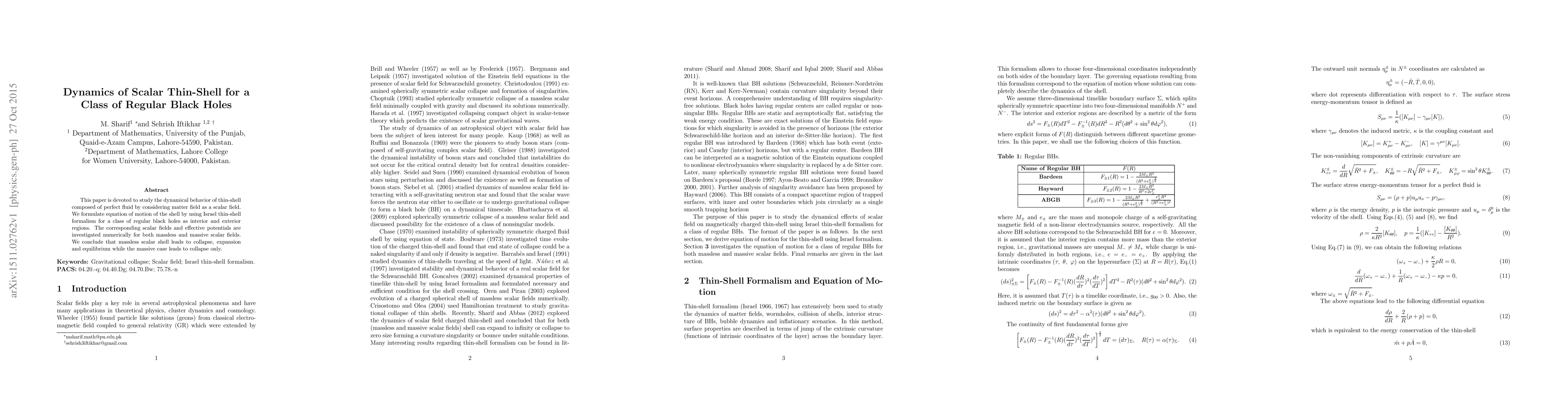 The paper uses the Israel thin-shell formalism to formulate the equation of motion for a thin-shell composed of a perfect fluid, considering the matter field as a scalar field. It numerically investigates the corresponding scalar fields and effective potentials for both massless and massive scalar fields in the context of regular black holes.