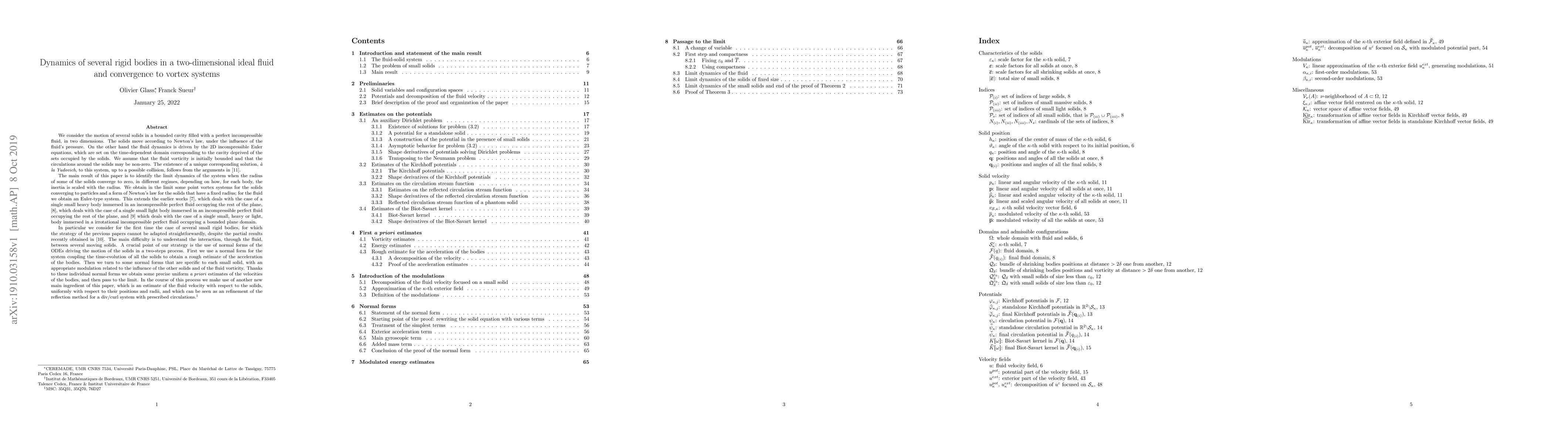This paper studies the dynamics of multiple rigid bodies in a two-dimensional ideal fluid, focusing on the convergence behavior as some bodies shrink to zero radius. It identifies the limit dynamics, resulting in point vortex systems for the shrinking bodies and a modified Newton's law for bodies of fixed radius, while the fluid follows an Euler-type system. The analysis employs normal forms of the ODEs to understand the interaction between small moving solids and the fluid vorticity.