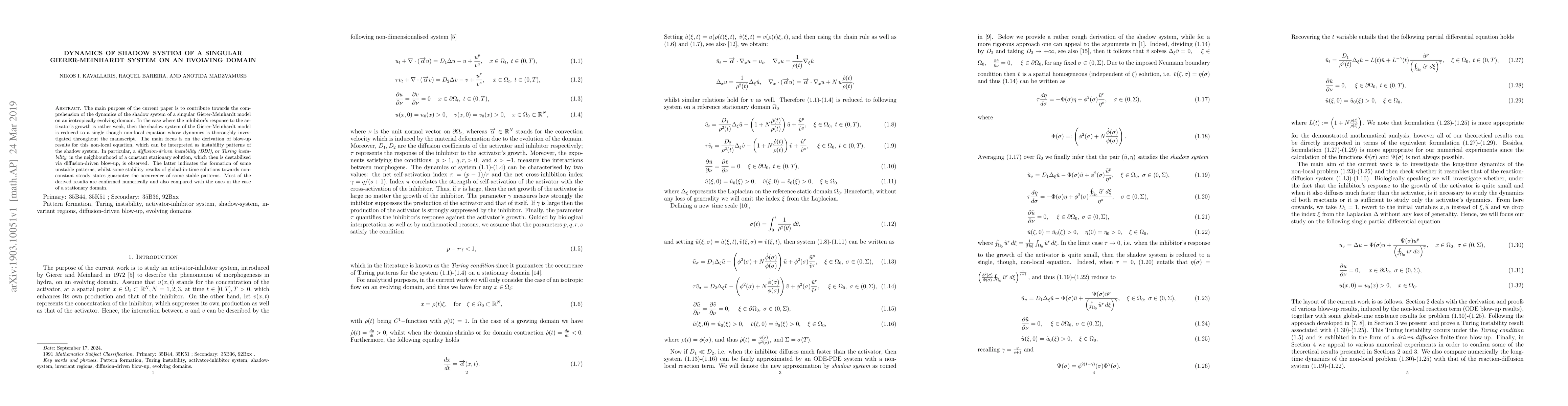 This paper investigates the dynamics of a singular Gierer-Meinhardt model's shadow system on an evolving domain, focusing on the derivation of blow-up results for a non-local equation. It reveals diffusion-driven instability patterns leading to unstable pattern formation and stability results for global-in-time solutions.