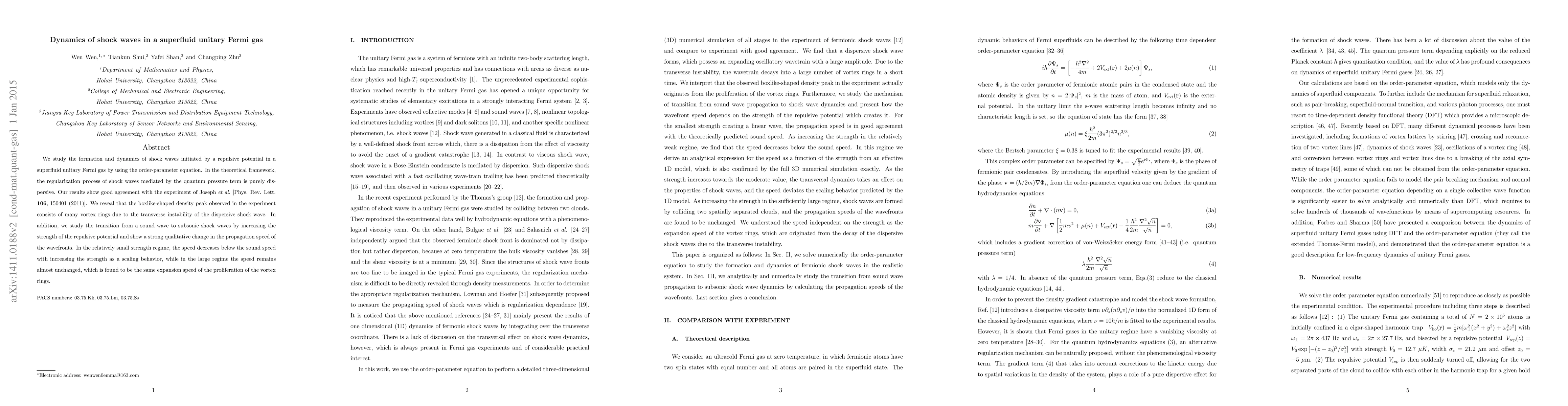 This paper investigates shock wave dynamics in superfluid unitary Fermi gas, revealing that shock waves undergo regularization via quantum pressure and transition from sound waves to subsonic shock waves. The study shows experimental agreement and identifies vortex rings as the cause of the boxlike density peak.