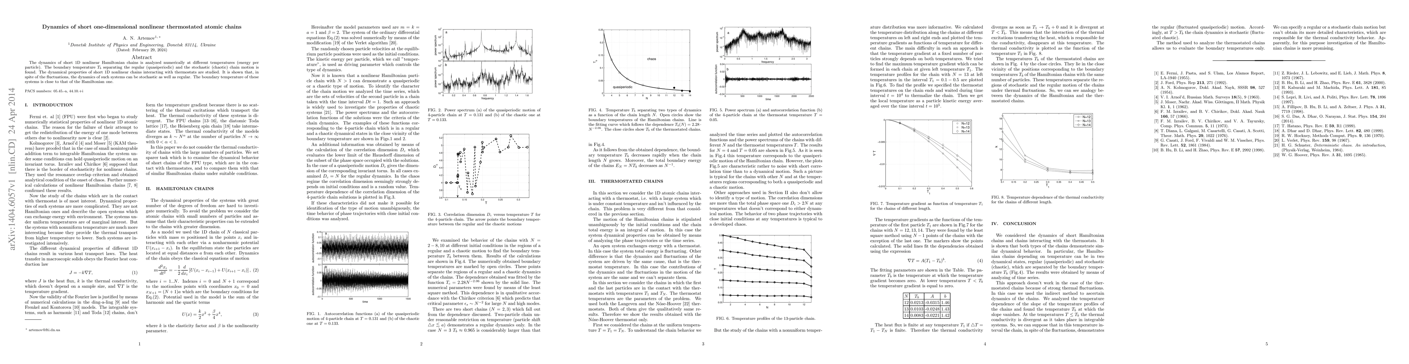 This paper numerically analyzes the dynamics of short one-dimensional nonlinear atomic chains at various temperatures, identifying a boundary temperature that separates regular quasiperiodic and stochastic chaotic motion. The study also examines the effects of thermostats, showing that despite fluctuations, the dynamics can be both stochastic and regular, with the boundary temperature similar to that of non-thermostated chains.