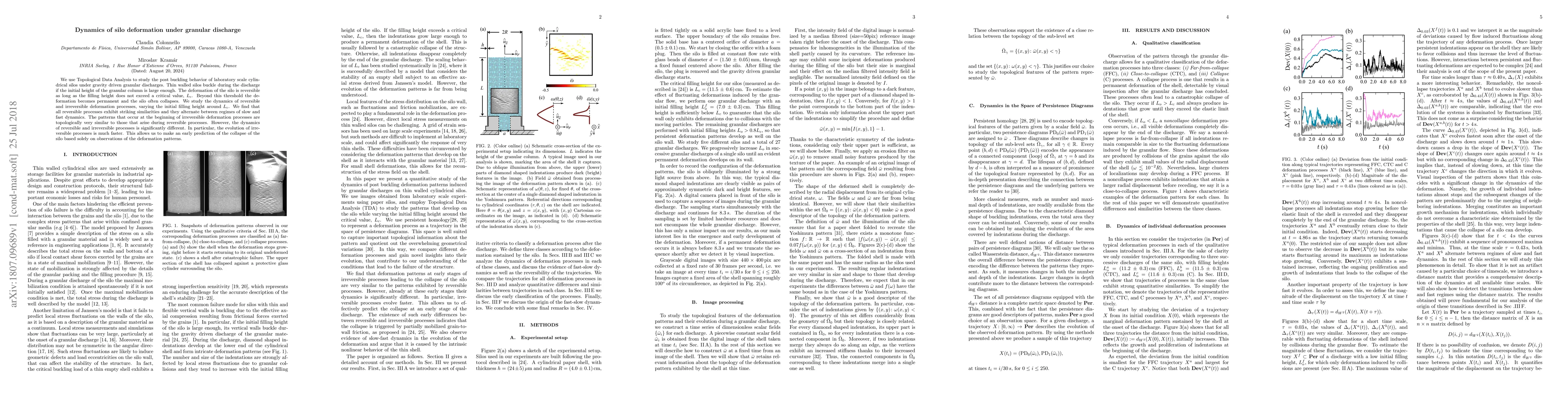 Researchers used Topological Data Analysis to study silo deformation under granular discharge, finding reversible processes that alternate between slow and fast dynamics, while irreversible processes have significantly faster evolution.