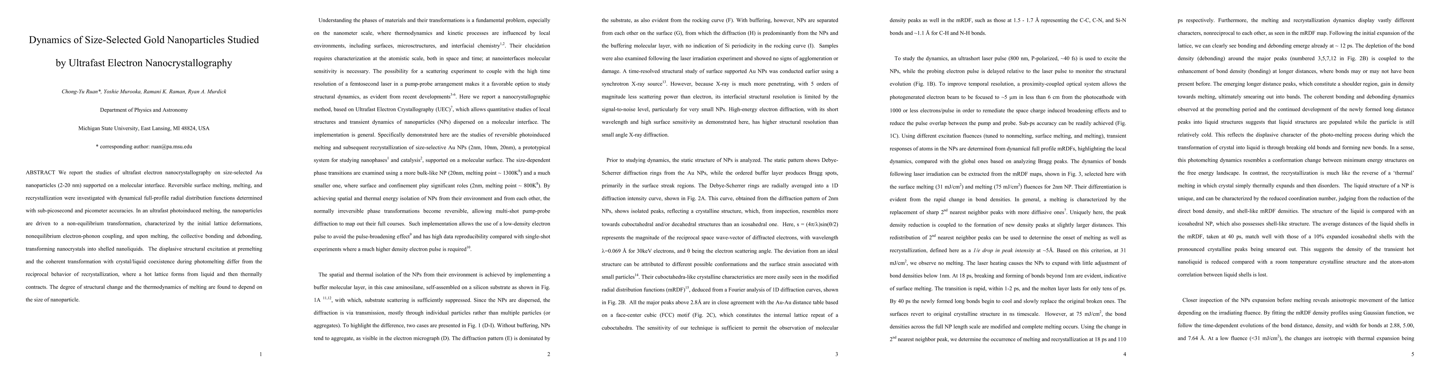 We report the studies of ultrafast electron nanocrystallography on size-selected Au nanoparticles (2-20 nm) supported on a molecular interface. Reversible surface melting, melting, and recrystallization were investigated with dynamical full-profile radial distribution functions determined with sub-picosecond and picometer accuracies. In an ultrafast photoinduced melting, the nanoparticles are driven to a non-equilibrium transformation, characterized by the initial lattice deformations, nonequilibrium electron-phonon coupling, and upon melting, the collective bonding and debonding, transforming nanocrystals into shelled nanoliquids. The displasive structural excitation at premelting and the coherent transformation with crystal/liquid coexistence during photomelting differ from the reciprocal behavior of recrystallization, where a hot lattice forms from liquid and then thermally contracts. The degree of structural change and the thermodynamics of melting are found to depend on the size of nanoparticle.